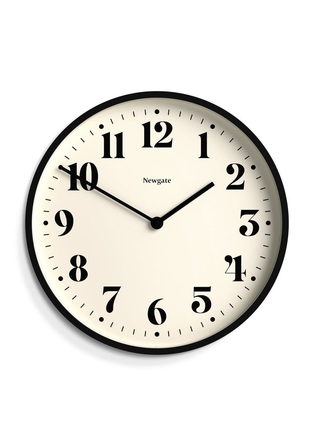 Newgate Number Two Wall Clock Matte Black A modern black wall clock with a contemporary theatre dial and matt black painted case.- Dimensions: HWD 45 x 45 x 5cm; 1.6kg- Materials: Acrylic case, metal hands and glass lens- Colour: Matt black painted- Movement: Quartz. This is a ticking clock. - Power: Requires 1 x high quality branded alkaline AA battery (not included)