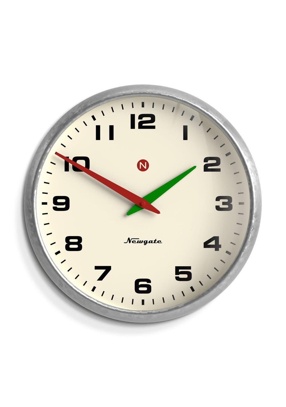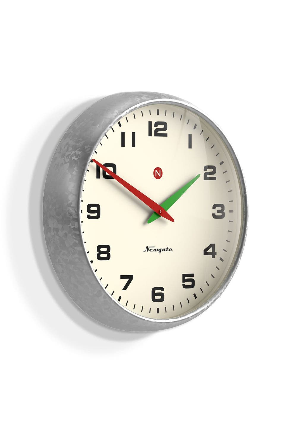 Newgate Superstore Wall Clock Alpha Dial Galvanised A large retro-style wall clock with a galvanised case and contrasting red and green hands.The vintage-influenced design features a retro dial and compass hands behind a glass lens. This large wall clock is perfect for adding style and function to a kitchen where wall space is no issue. - Size: HWD 40 x 40 x 8.6cm; 1.4kg- Materials: Metal case, metal hands and glass lens- Colour: Galvanised- Movement: Quartz 'Silent Sweep‚- Power: Requires 1 x high quality branded alkaline AA battery (not included)