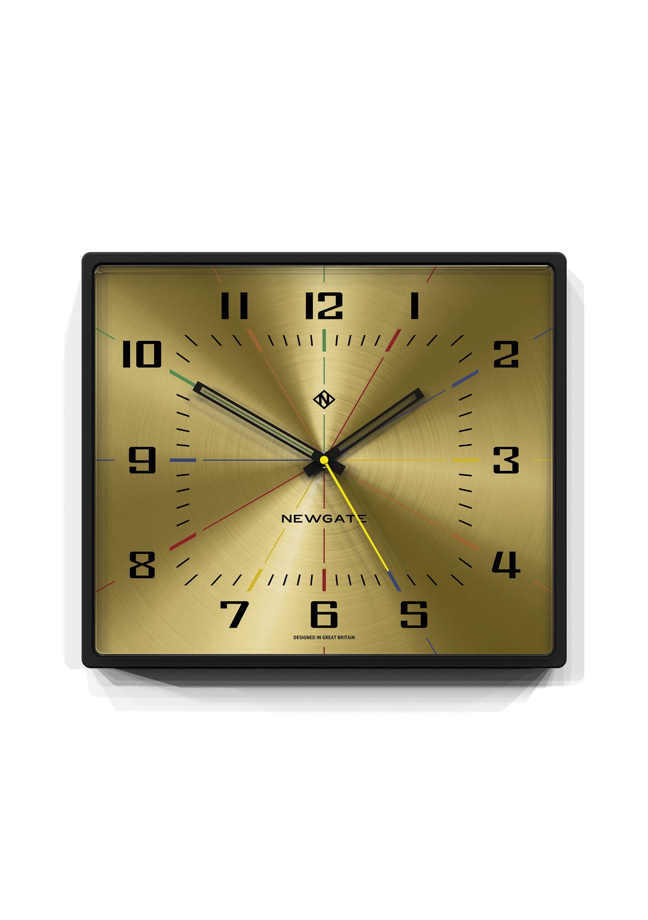 Newgate Box Office Wall Clock Brass Mid-Century Wall Clock | Black and Spun Brass Effect | Rectangular. A mid-Century modern wall clock with a spun gold/brass effect face and retro screen printed dial with multicoloured hour markers.The rectangular case is finished in matt black silicone and holds a moulded acrylic lens which projects forwards from the dial.Known as ‚silent sweep‚ in the industry, the hands move in a constant sweeping motion rather than a stepped tick. So you won‚t hear any ticking but if your hearing is particularly sensitive in a completely silent room you may hear a very quiet whirring. - Material: Acrylic, Metal, Glass- Colour: Black & Gold- Movement: Quartz- Power: 1 x AA Battery Required (Not Included)- Dimensions: LWH 9 x 36 x 41.7- Weight: 1.67