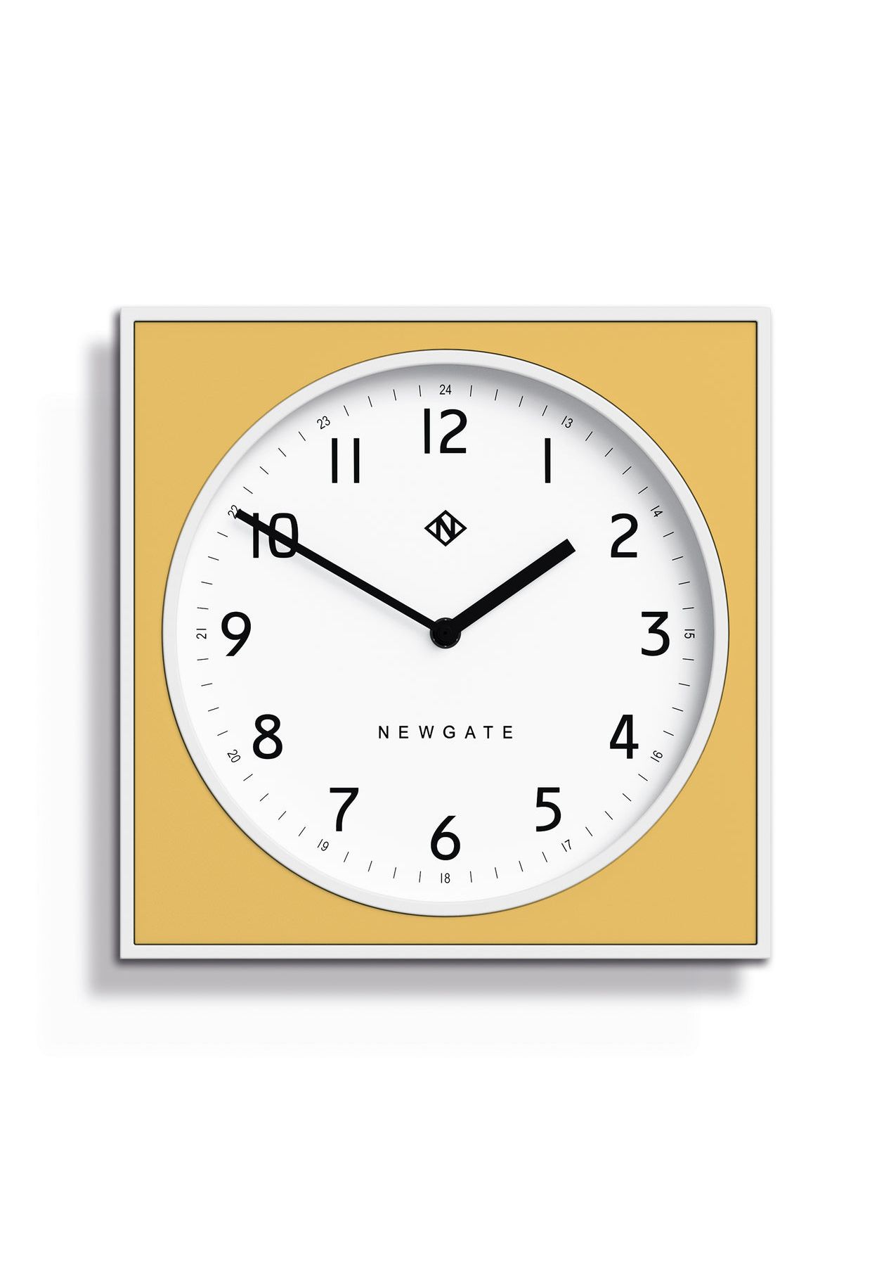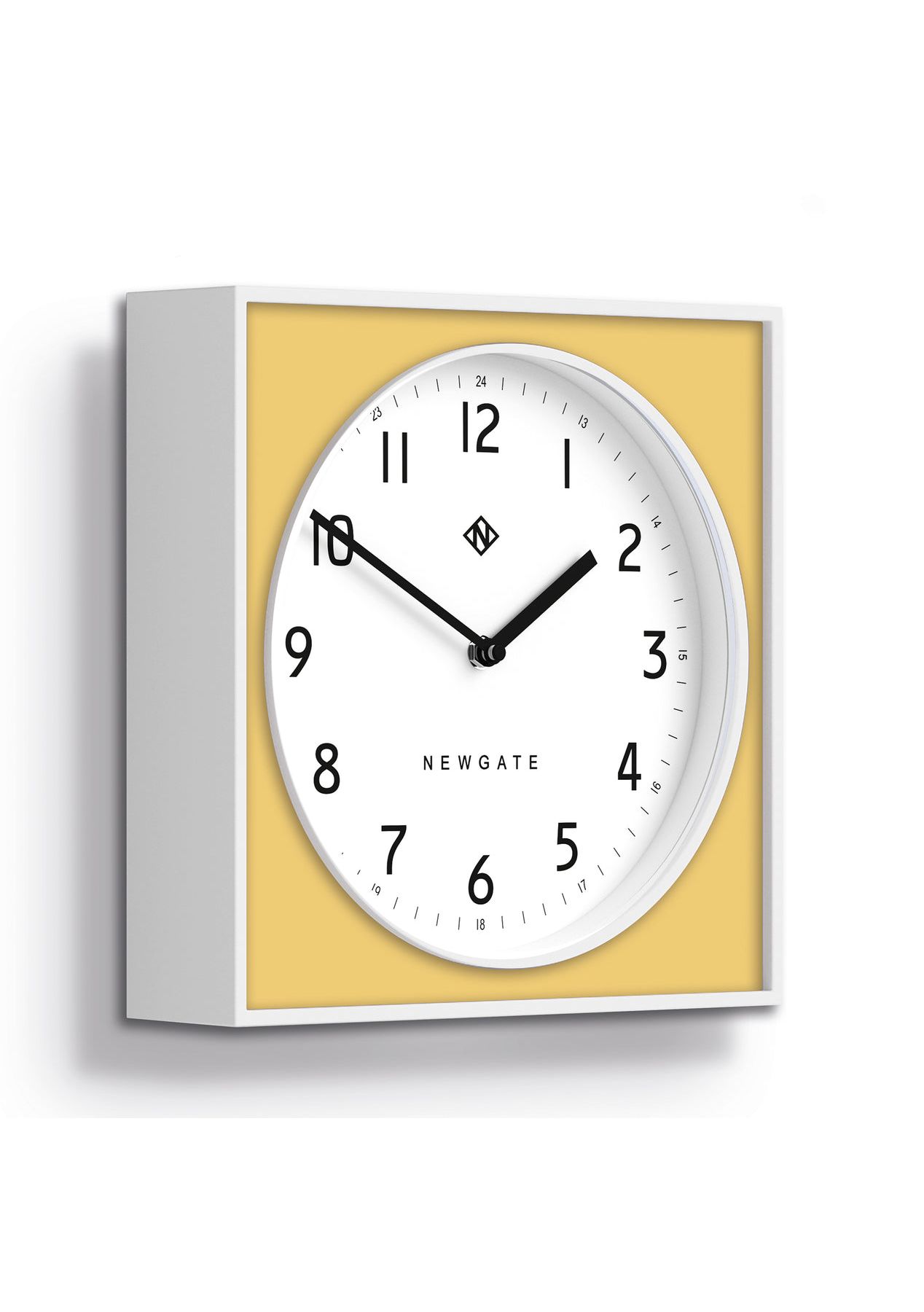 Newgate Burger & Chips Wall Clock Cheeky Yellow Modern Wall Clock | White with a Yellow Panel | Square. A white square wall clock with a round modern graphic dial and a colourful panel.The Burger & Chips wall clock is available in a range of colourful matt finishes including our vibrant 'Squeezy' Yellow option.A colourful wall clock is the ideal way to brighten up a room, whether that's the kitchen, living room or office. - Material: Acrylic, Metal- Colour: Yellow and White- Movement: Quartz 'Silent Sweep'- Power: 1 x AA (Not Included)- Dimensions: LWH 7 x 29 x 29cm- Weight: 0.86kg
