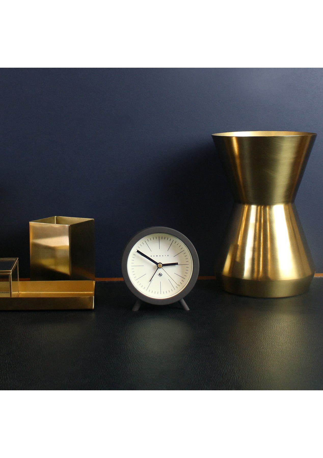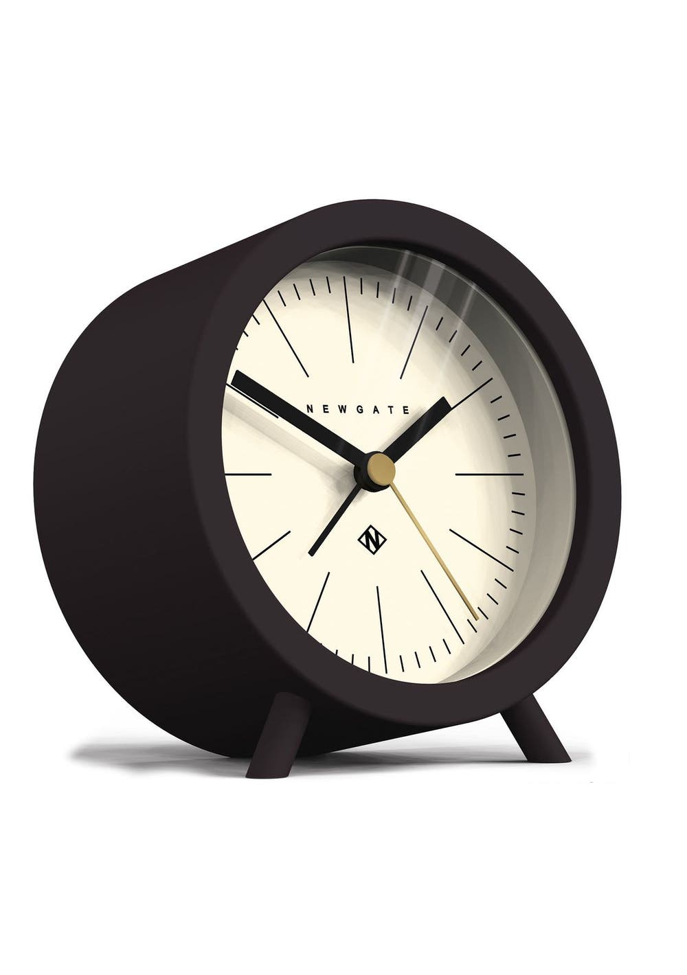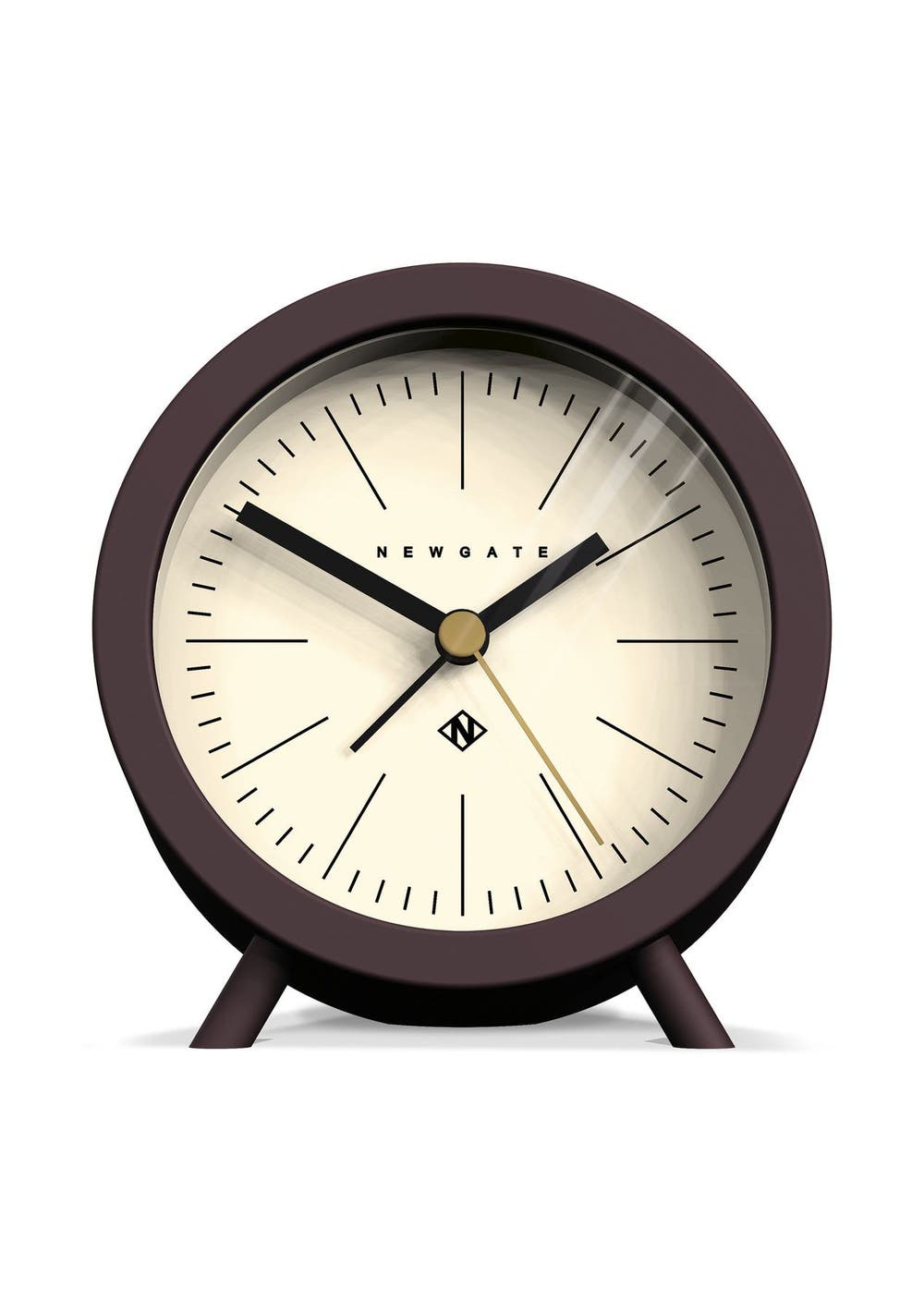 Newgate Fred Alarm Chocolate Black Mid-Century Modern Alarm Clock | Chocolate BlackA mid-Century modern alarm clock in 'Chocolate Black'. A matt silicone-finish barrel case rests on angled legs, with a minimalist marker dial and digital beep alarm.Known as ‚silent sweep‚ in the industry, the hands move in a constant sweeping motion rather than a stepped tick. So you won‚t hear any ticking but if your hearing is particularly sensitive in a completely silent room you may hear a very quiet whirring. - Material: Acrylic, Metal, Glass- Colour: Brown- Movement: Quartz 'Silent Sweep'- Power: 1 x AA (not included)- Dimensions: 12 x 11 x 7cm- Weight: 0.17kg