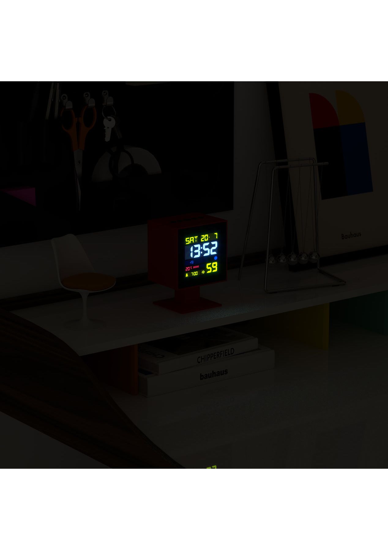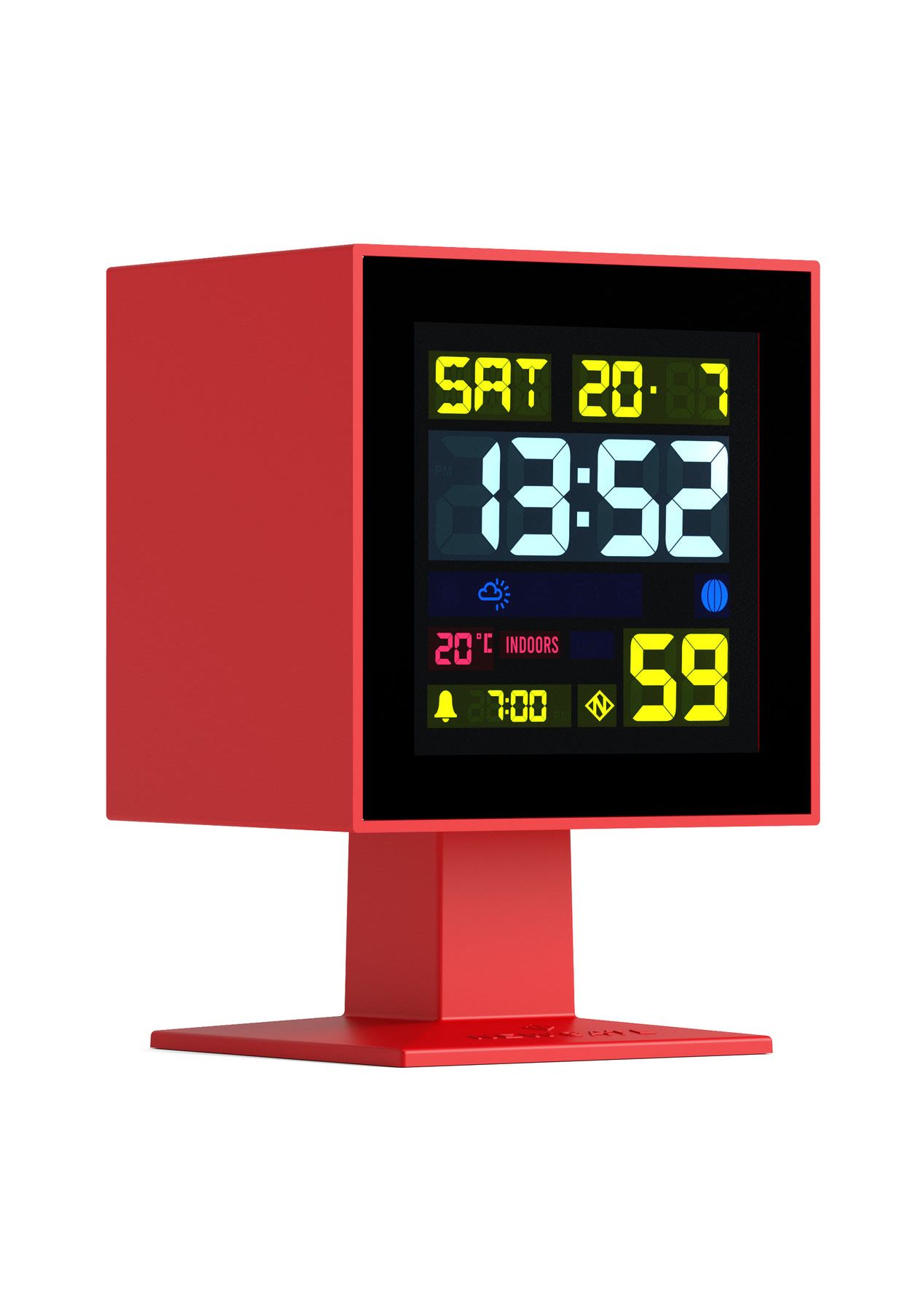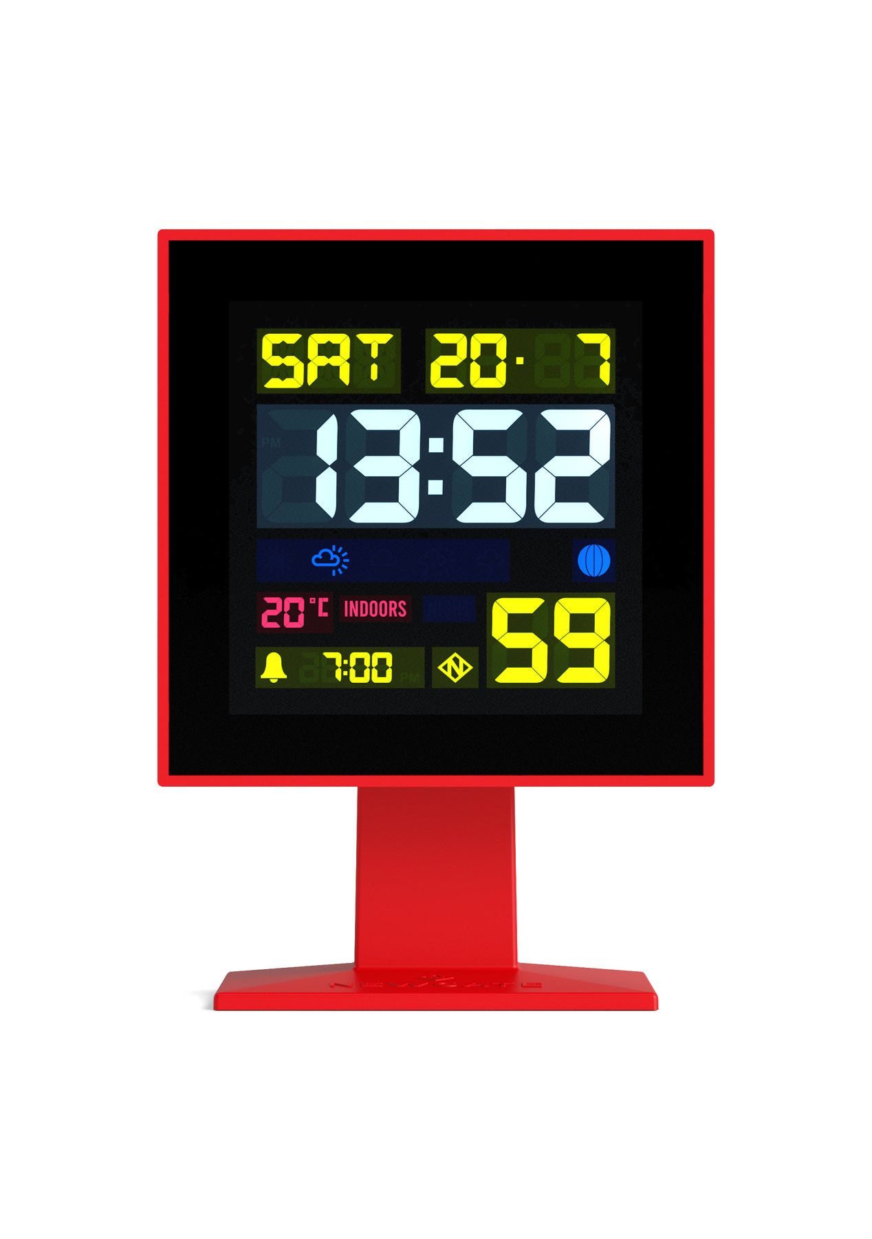 Newgate Monolith Lcd Alarm Clock Fire Engine Red Angular, red LCD alarm clock on a square stand with a black screen and bright, coloured digits. The Monolith offers ground-breaking retro aesthetics and impressive functionality. The unusual alarm clock design incorporates a 12 or 24-hour time display, a digital alarm and snooze function, with room temperature, moon phase and weather predictions.The screen will be dimmer when running on batteries alone, but bright when you hit the button on top, unless you have the USB cable connected in which case the screen will be really bright.The display will only be backlit continuously when connected to a power source with the included USB cable or a DC adaptor (not included). 3 x AAA batteries (not included) are required to retain time and alarm settings - 12 or 24-hour format- LCD screen- Alarm and snooze function- Temperature display 0-37°C- Night screen brightness setting- Weather forecast prediction & moon phase- USB power cable included- Material: Acrylic, LCD- Colour: Red/Black- Movement: Digital- Power: Connect to DC or 3 x AAA Batteries (Not Included)- Dimensions: HWD 14 x 10 x 8 cm / 5.5 x 3.9 x 3.1in - Weight: 0.25kg