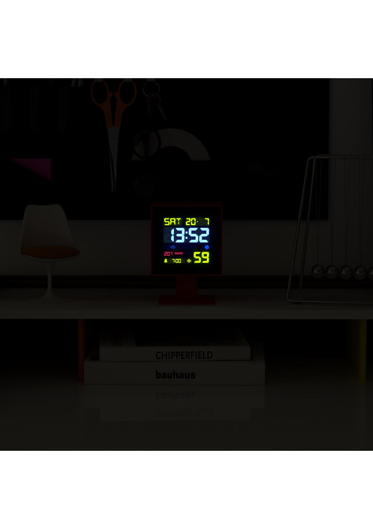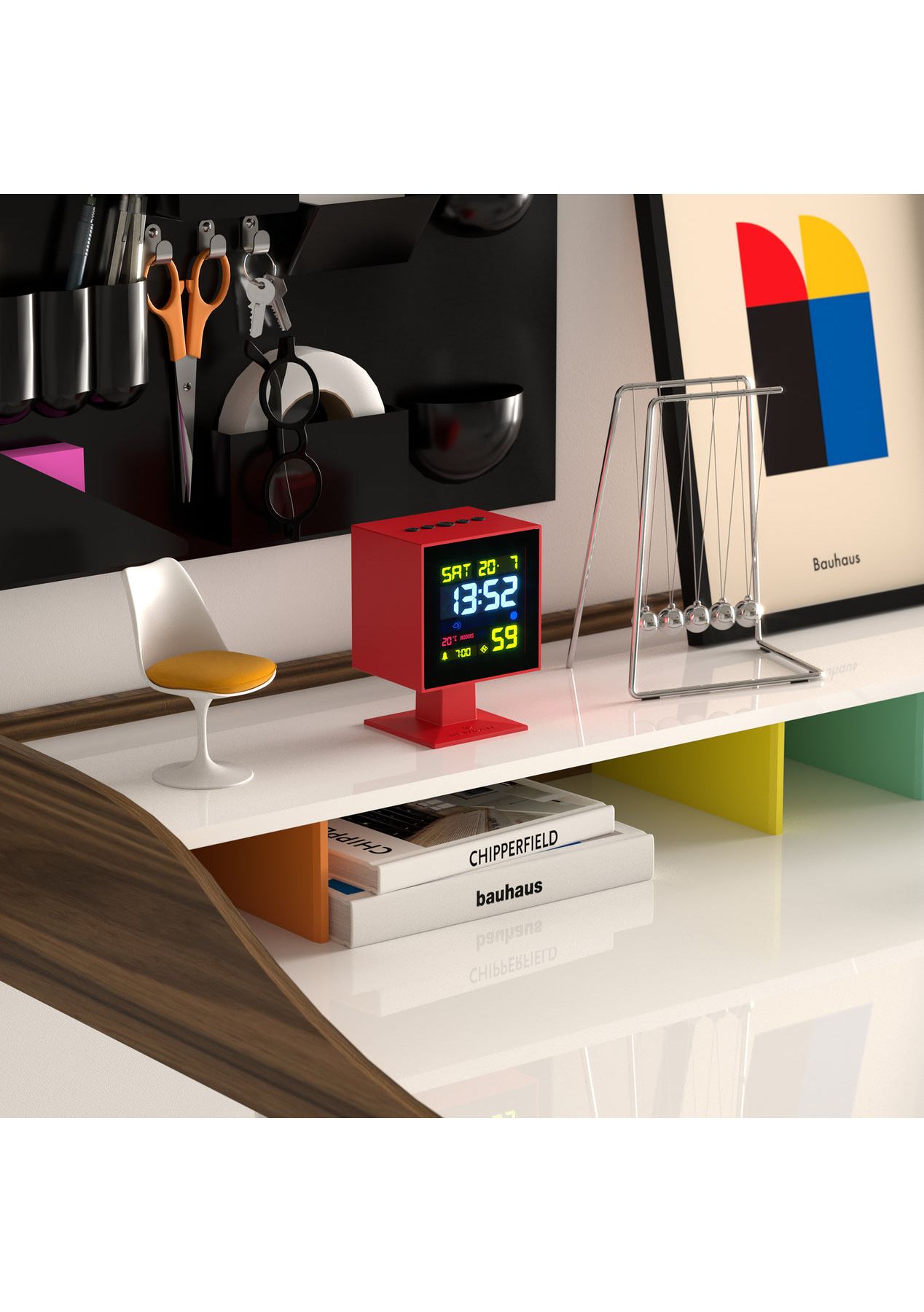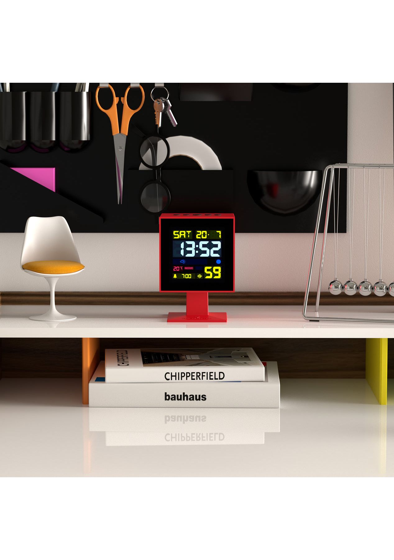 Newgate Monolith Lcd Alarm Clock Fire Engine Red Angular, red LCD alarm clock on a square stand with a black screen and bright, coloured digits. The Monolith offers ground-breaking retro aesthetics and impressive functionality. The unusual alarm clock design incorporates a 12 or 24-hour time display, a digital alarm and snooze function, with room temperature, moon phase and weather predictions.The screen will be dimmer when running on batteries alone, but bright when you hit the button on top, unless you have the USB cable connected in which case the screen will be really bright.The display will only be backlit continuously when connected to a power source with the included USB cable or a DC adaptor (not included). 3 x AAA batteries (not included) are required to retain time and alarm settings - 12 or 24-hour format- LCD screen- Alarm and snooze function- Temperature display 0-37°C- Night screen brightness setting- Weather forecast prediction & moon phase- USB power cable included- Material: Acrylic, LCD- Colour: Red/Black- Movement: Digital- Power: Connect to DC or 3 x AAA Batteries (Not Included)- Dimensions: HWD 14 x 10 x 8 cm / 5.5 x 3.9 x 3.1in - Weight: 0.25kg