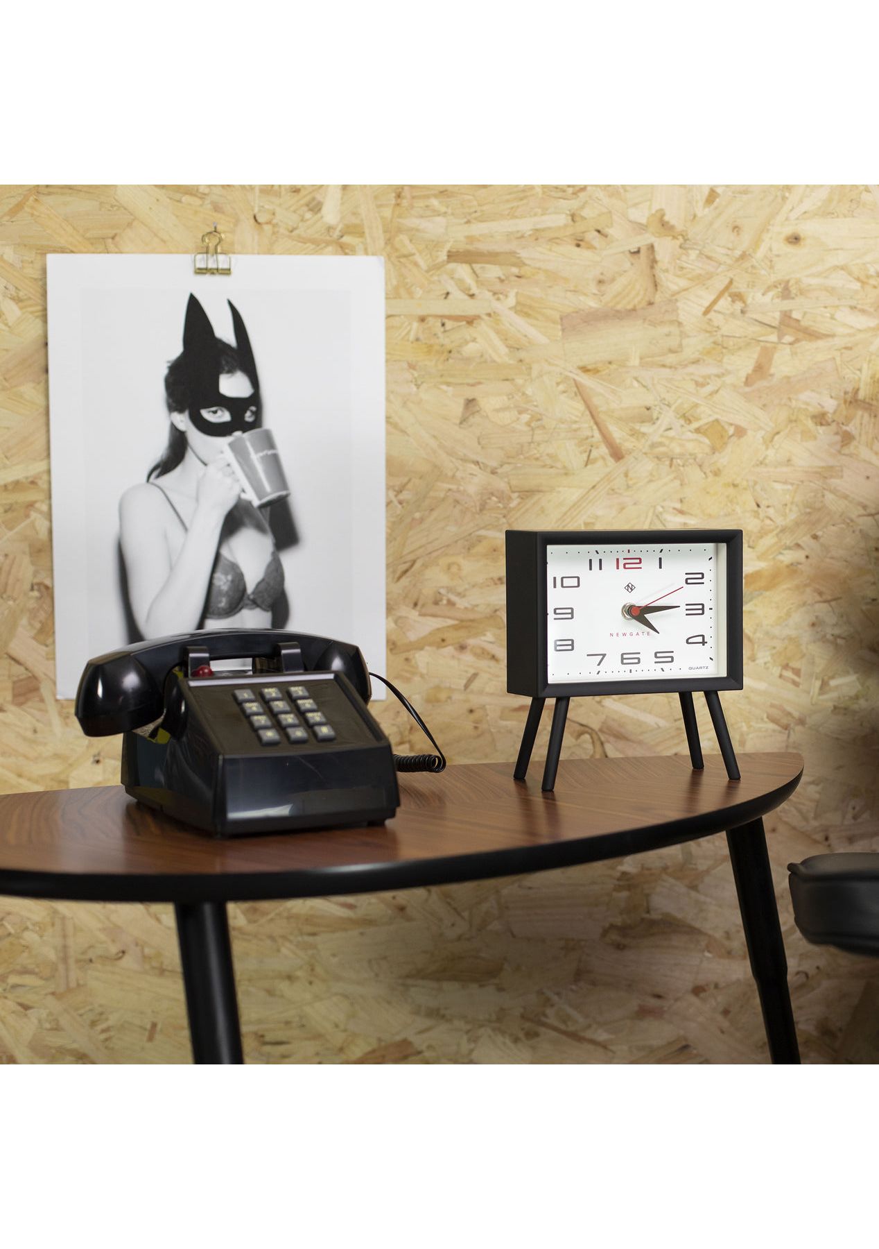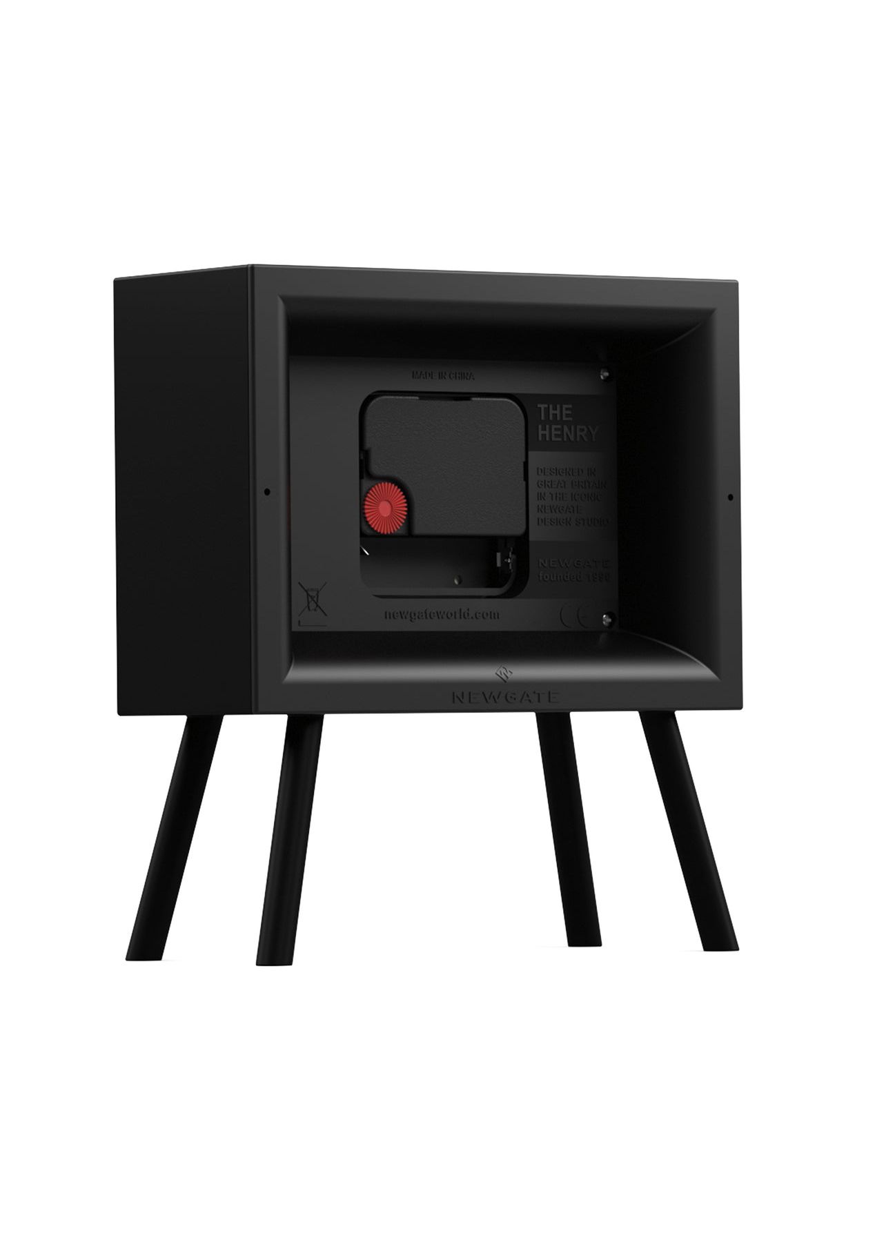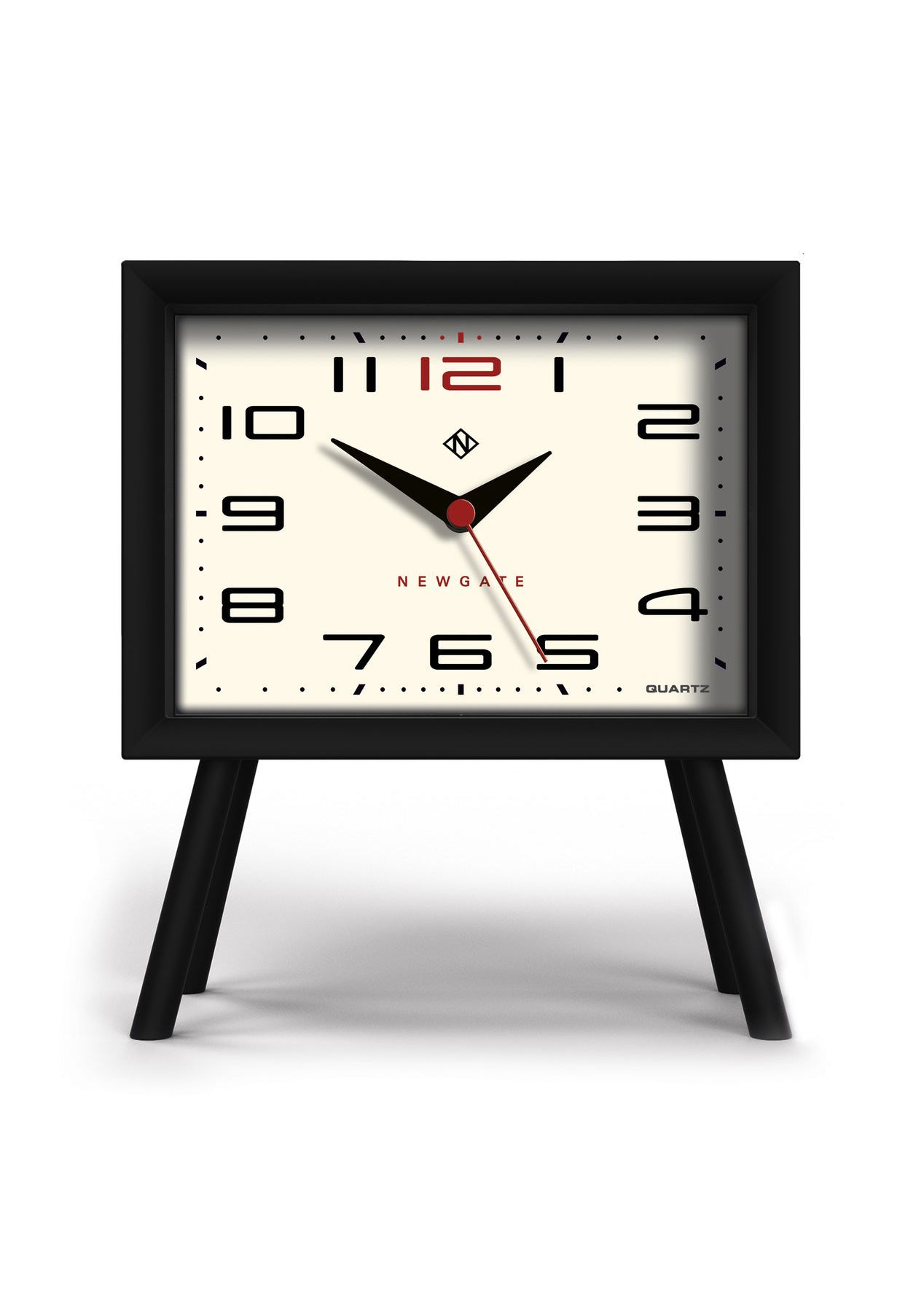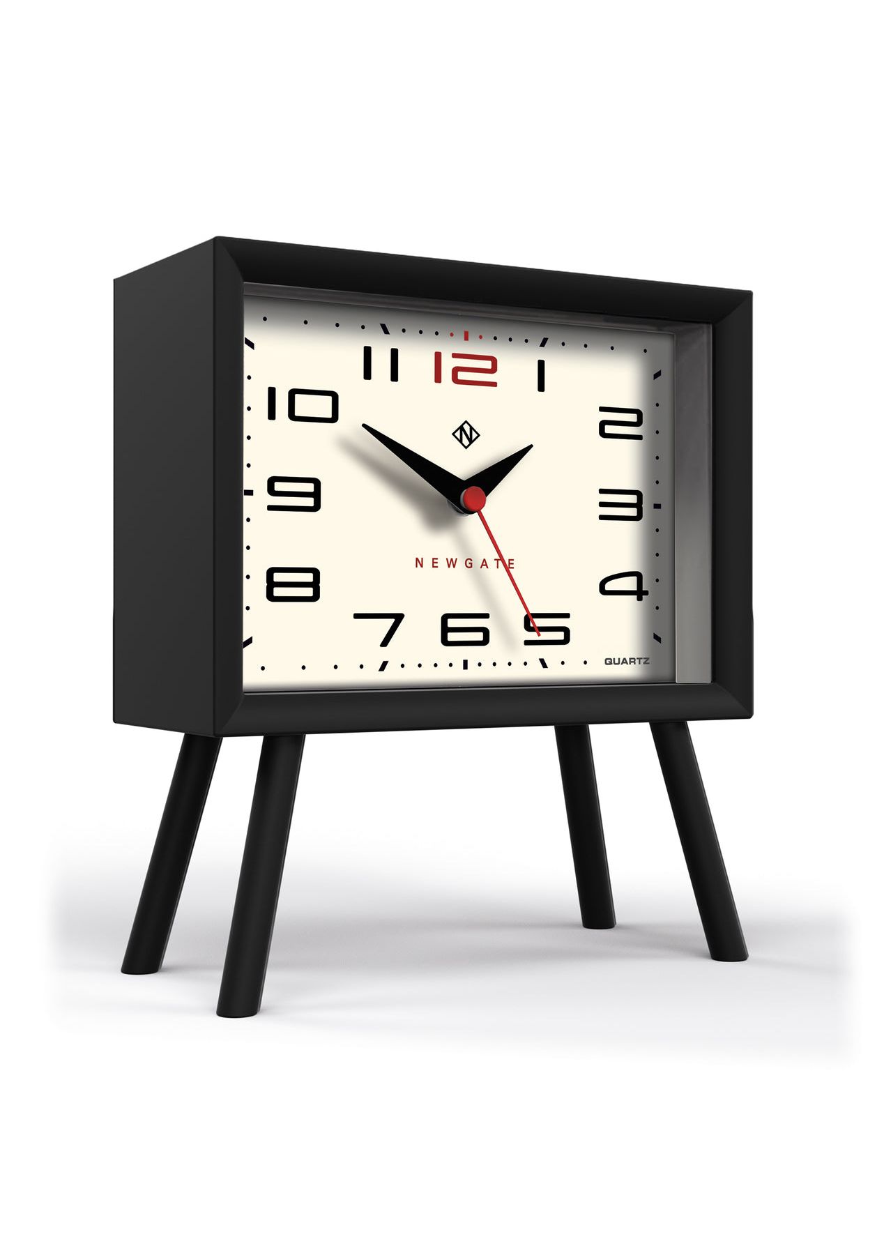 Newgate Henry Mantel Clock Neutral Mono Ii Dial Mid-Century Modern Mantel Clock | Black & CreamModern space-age design fuses with mid-Century retro style in the Henry mantel clock. A rectangular case coated in matt black silicone holds a cream dial. The contemporary mantel clock stands on elongated angled legs.Known as ‚silent sweep‚ in the industry, the hands move in a constant sweeping motion rather than a stepped tick. So you won‚t hear any ticking but if your hearing is particularly sensitive in a completely silent room you may hear a very quiet whirring. - Material: Acrylic, Metal, Glass- Colour: Black w/ Cream- Movement: Digital- Power: Connect to DC or 3 x AAA (not included)- Dimensions: LWH 7.5 x 16.6 x 19cm- Weight: 0.35kg