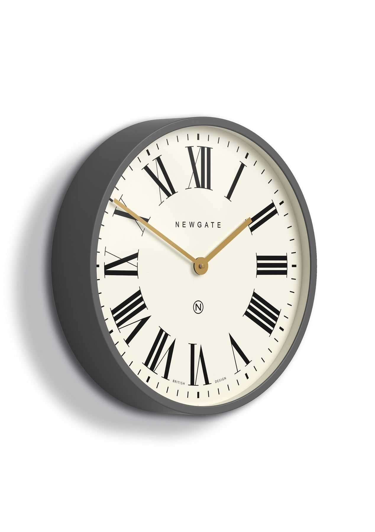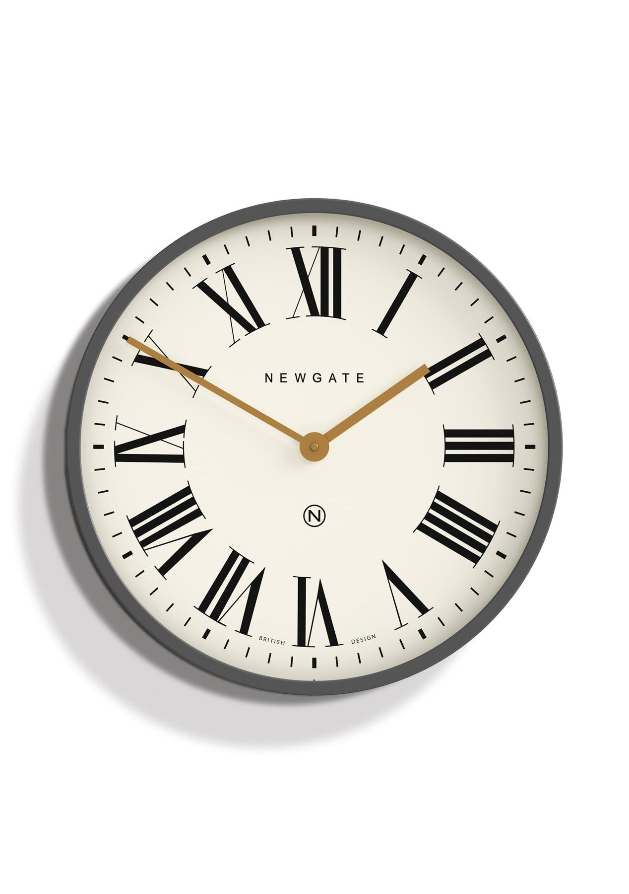Newgate Mr Butler Wall Clock Moonstone Grey A large grey wall clock with a classic Roman numeral dial and contemporary matt 'Moonstone Grey' case. This timeless wall clock is finished with a flat glass lens and brass-finish hands. - Material: Metal, Acrylic, Paper, Glass- Colour: Moonstone Grey & Cream- Movement: Quartz 'Silent Sweep'- Power: 1 x AA (not included)- Dimensions: LWH 9.2 x 45 x 45cm- Weight: 2.04kg