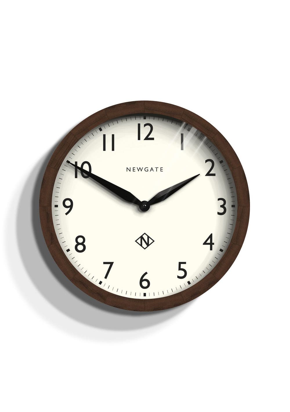 Newgate Wimbledon Clock Solid Wood A dark wood wall clock shaped from hand-assembled solid wood segments.A labour of love, the Wimbledon wall clock is crafted from narrow triangles of timber which are formed into a solid wood circle before the centre is cut out to make space for the inner dial. The straight-cut wooden case holds a glass lens and metal hands.A contemporary classic, the Wimbledon wall clock creates a handsome focal point in the kitchen, living room or office.Please note, this clock is made from real wood so there may be slight variations in the colour and grain as well as some natural wood knots, lines and joins. - Material: Solid Wood, Metal Hands, Glass Lens- Colour: Solid Wood w/ White Dial- Movement: Quartz- Power: 1 x AA (not included)- Dimensions: LWH 1.6 x 45 x 45cm; 0.25kg