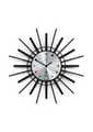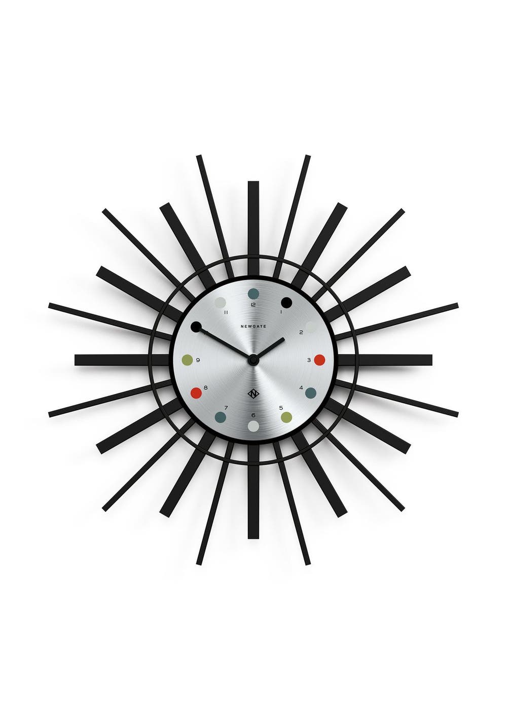 Newgate Stingray Wall Clock Black - Silver Dial A retro style sunburst wall clock with matt black sunrays and a contemporary Arabic and dot spun aluminium dial and straight metal hands. Known as ‚silent sweep‚ in the industry, the hands move in a constant sweeping motion rather than a stepped tick. So you won‚t hear any ticking but if your hearing is particularly sensitive in a completely silent room you may hear a very quiet whirring. - Dimensions: HWD 44 x 44 x 2.5cm; 0.34kg- Materials: Matt Black acrylic case and metal hands- Colour: Matt black case with spun aluminium effect dial- Movement: Quartz ‚Silent Sweep‚- Power: Requires 1 x high-quality branded alkaline AA batteries (not included)