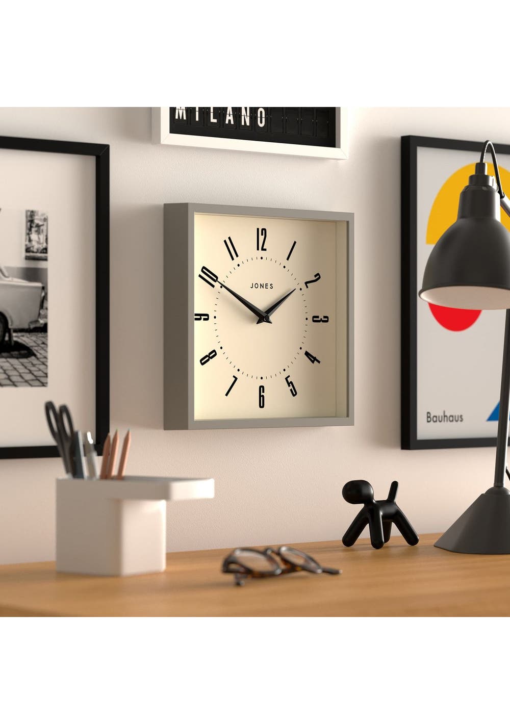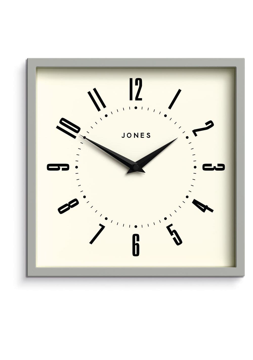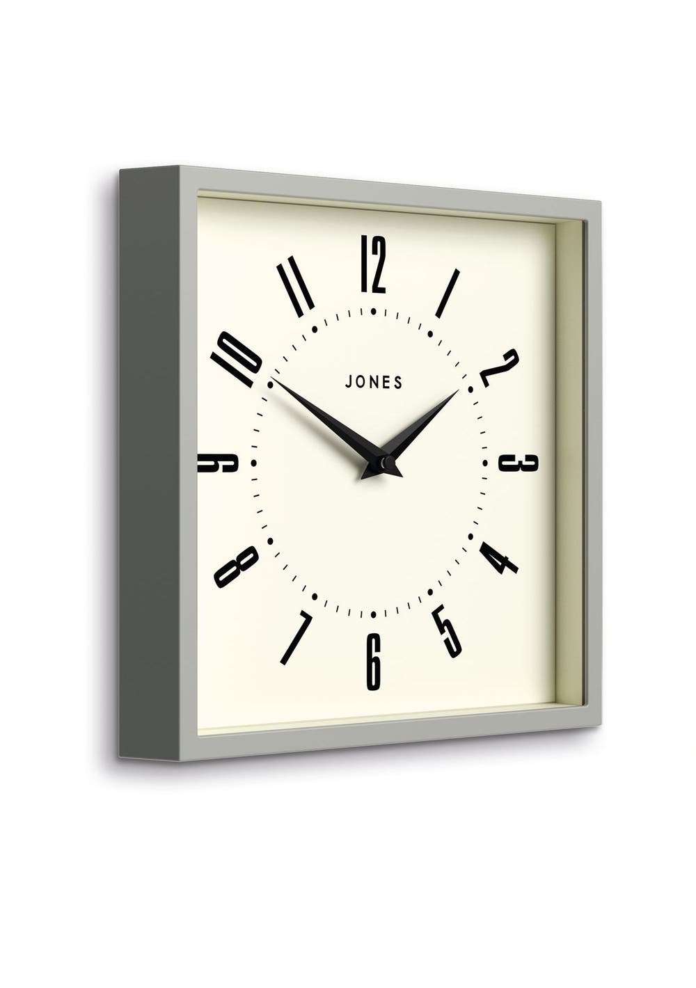 Newgate Jones Box Wall Clock Grey. A square wall clock with a retro Arabic dial and contemporary Pepper Grey case. The retro dial is complimented, by triangulation hands, a straight cut case and glass lens.This on-trend wall clock will hang happily in the bedroom, kitchen or living room, adding the finishing touch to your decor. *Limited Model, Until Stocks Last*Specifications- Materials: Acrylic, Metal, Glass- Colour: Matte Grey & White- Movement: Quartz. This is a ticking clock.- Power: 1 x AA Battery (not included)- Dimensions: HWD 25 x 25 x 4cm / 9.8 x 9.8 x 1.8in- Weight: 0.65kg