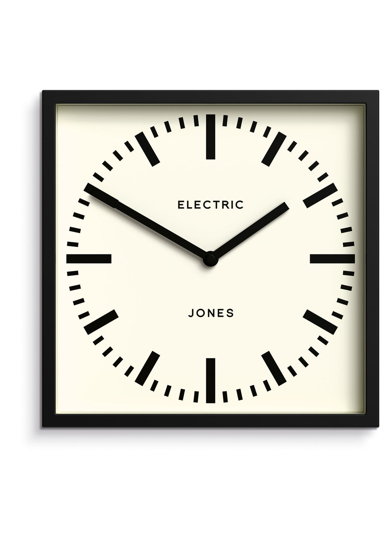 Newgate Jones Box Wall Clock Black A square wall clock with a round railway dial and contemporary black case. The railway dial is complimented, by minimalistic straight hands, a straight-cut case and a glass lens.This on-trend wall clock will hang happily in the bedroom, kitchen or living room, adding the finishing touch to your decor. *Limited Model, Until Stocks Last* - Materials: Acrylic, Metal, Glass- Colour: Matt Black & White- Movement: Quartz. This is a ticking clock.- Power: 1 x AA Battery (not included)- Dimensions: HWD 25 x 25 x 4cm / 9.8 x 9.8 x 1.8in- Weight: 0.65kg