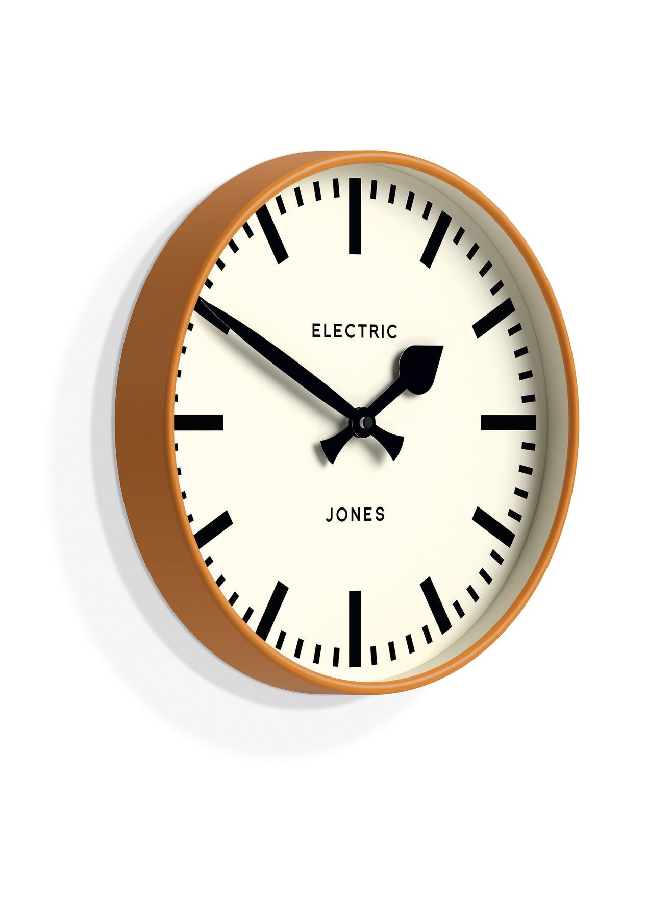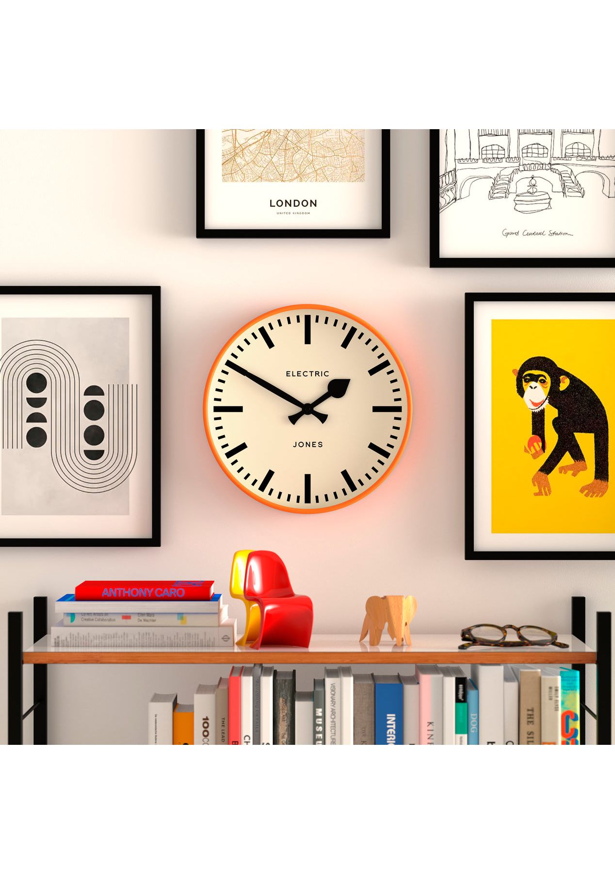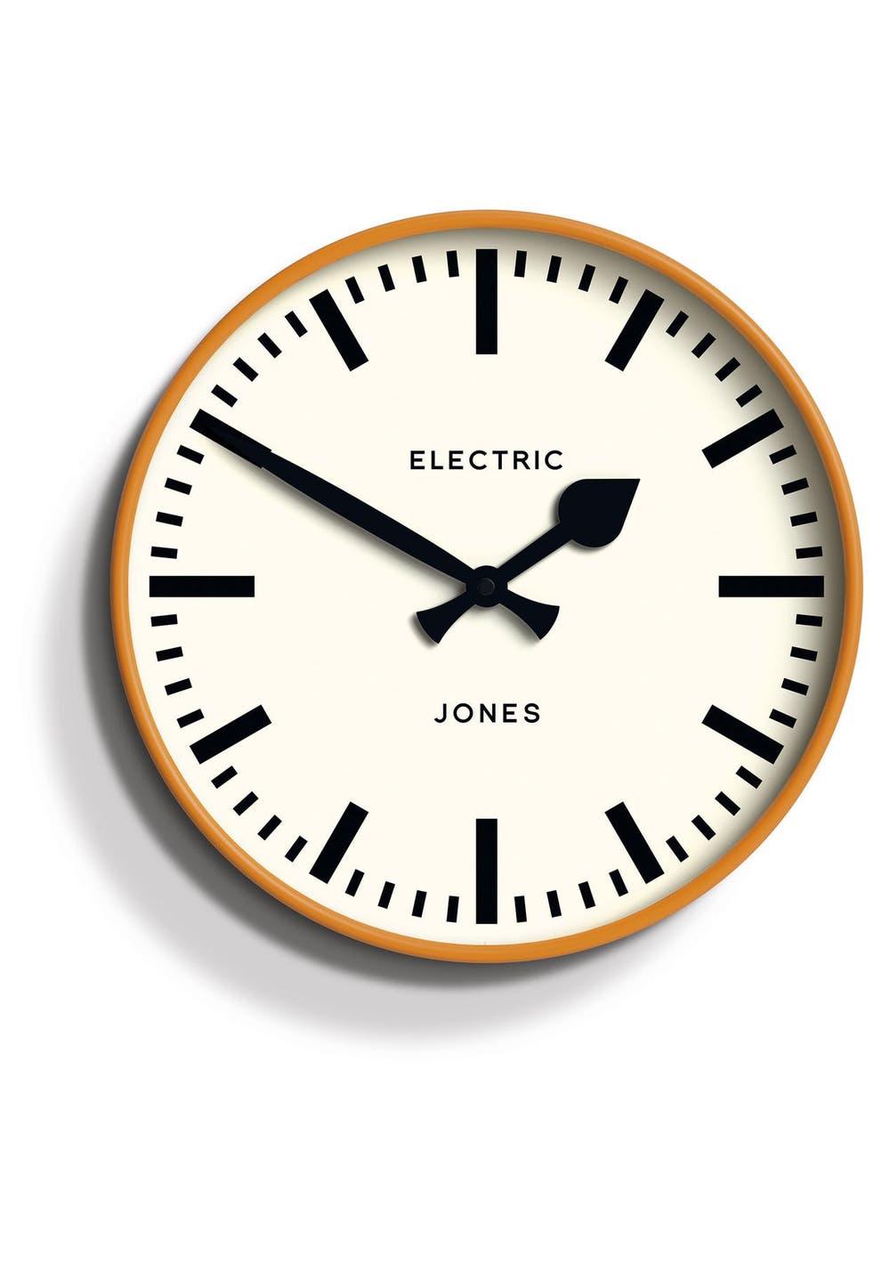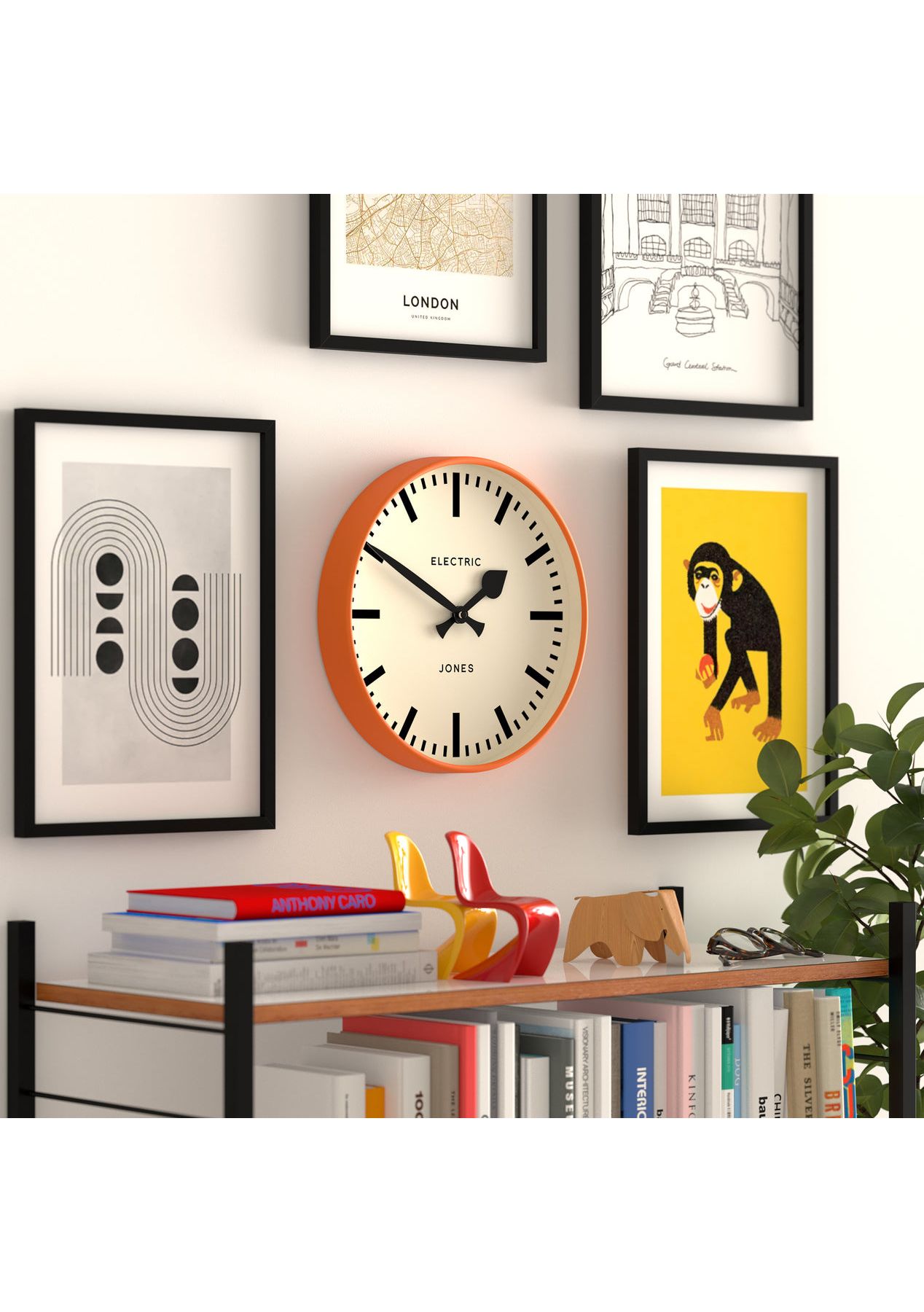 Newgate Jones Railway Wall Clock Orange A wall clock with a railway dial and contemporary 'fizzy' orange case. The railway dial is complimented, by spade and baton black hands, a straight-cut case and a glass lens.This on-trend wall clock will hang happily in the bedroom, kitchen or living room, adding the finishing touch to your decor.- Materials: Acrylic, Metal, Glass- Colour: Orange- Movement: Quartz. This is a ticking clock.- Power: 1 x AA Battery (not included)- Dimensions: HWD 30 x 30 x 4.3cm / 11.8 x 11.8 x 1.7in- Weight: 0.68kg