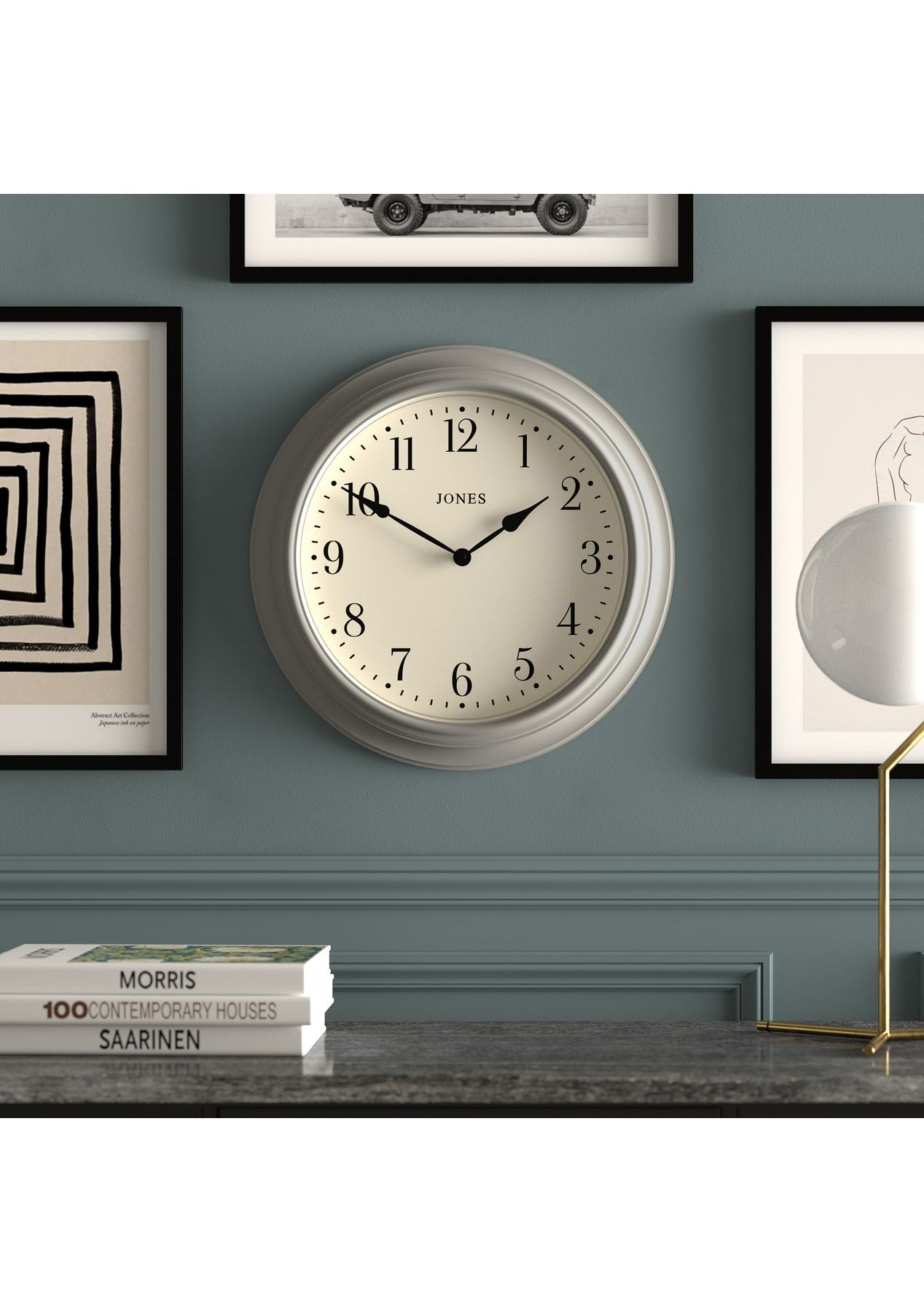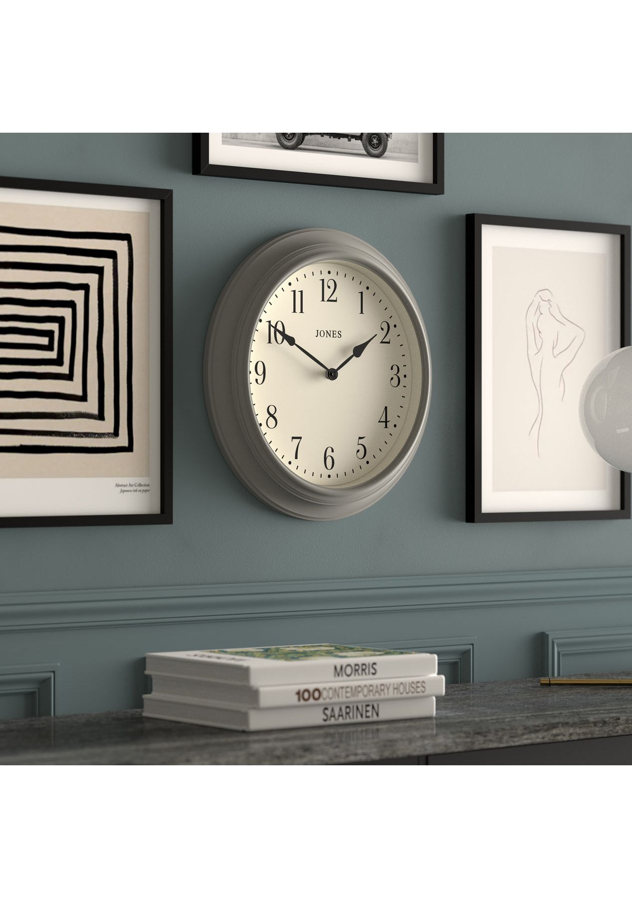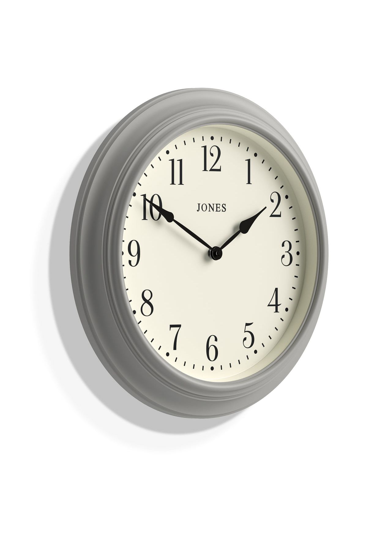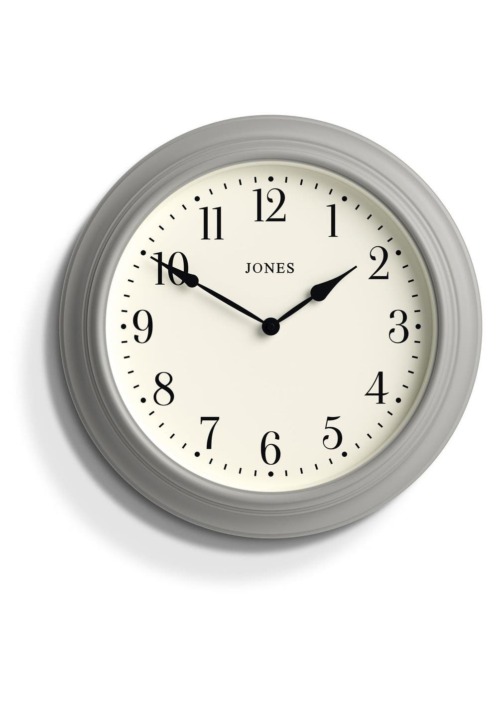 Newgate Jones Supper Club Clock Cloud Grey A classic grey Arabic numeral wall clock. The decorative moulded case is finished in matt 'Cloud Grey' with black metal spade hands and a flat glass lens.The timeless design works perfectly in the kitchen, hallway or living room. - Material: Acrylic, Metal, Glass- Colour: Cloud Grey- Movement: Quartz. This is a Ticking Clock- Power: 1 x AA Battery Required (Not Included)- Dimensions: HWD 40.5 x 40.5 x 4.3cm / 16 x 16 x 1.7in- Weight: 0.71kg