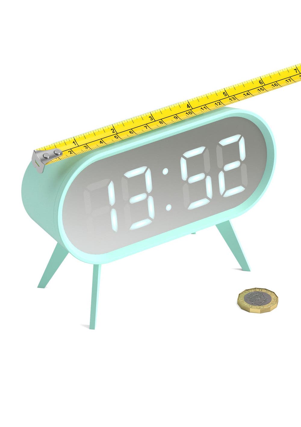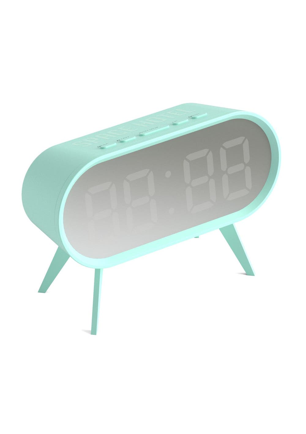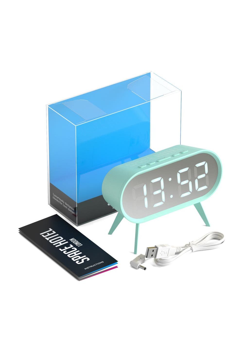 Newgate Space Hotel Cyborg Led Alarm Clock Blue This futuristic digital alarm clock is inspired by space exploration and the design of the lunar landing craft. A lozenge-shaped case coated in smooth matt blue silicone is raised on four angled tetrapod legs with a silver effect mirrored LED screen to display the time; a vital addition to any aspiring intergalactic explorer's bedside or desk. The unusual alarm clock design incorporates a 12 or 24-hour time display, a digital beep alarm, a snooze function, night mode and brightness adjustment, and an optional temperature display. The time will display continuously only when connected to a power source with the included USB cable or a DC adaptor (not included). 3 x AAA batteries (not included) are required to retain time and alarm settings.- 12 or 24-hour format- Digital beep alarm- Snooze function with intervals of 5 - 60 minutes- Temperature display- Night mode function with automatic dimming- 2 x brightness settings- Size: HWD 11.9 x 14 x 6cm / 4.7 x 5.5 x 2.4in - Materials: Acrylic case, silver effect mirrored LED dial- Colour: Blue- Movement: Digital- Power: 1x USB cable included, 3 x high-quality branded AAA batteries (not included), DC input 5V/500mA - 1000mA (not included)