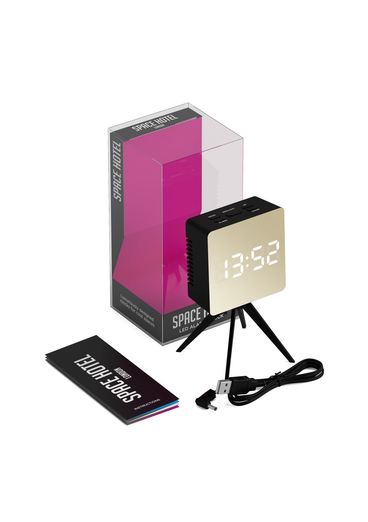 Newgate Space Hotel Droid Led Alarm Clock Black This futuristic digital alarm clock is inspired by space exploration and the design of the lunar landing craft. A squared case with a gold mirror effect LED screen is held upright by angled tetrapod legs coated in matt black silicone.The Droid makes both a vital addition to any aspiring intergalactic explorer's bedside table, and lends modernity to the office as a minimalist desk clock.The unusual design incorporates a 12 or 24-hour time display, a digital beep alarm, a snooze function, night mode and brightness adjustment, and an optional temperature display.- 12 or 24-hour format- Digital beep alarm- Snooze function with intervals of 5 - 60 minutes- Temperature display- Night mode function with automatic dimming- 2 x brightness settings- USB power cable included- Size: HWD 14.7 x 8.3 x 7.8cm; 0.10kg- Materials: Acrylic case, gold mirror effect LED dial- Colour: Black/Gold mirror effect- Movement: Digital- Power: 1x USB cable included, 3 x high-quality branded AAA batteries (not included), DC input 5V/500mA - 1000mA (not included) The time will display continuously only when connected to a power source with the included USB cable or a DC adaptor (not included). 3 x AAA batteries (not included) are required to retain time and alarm settings.