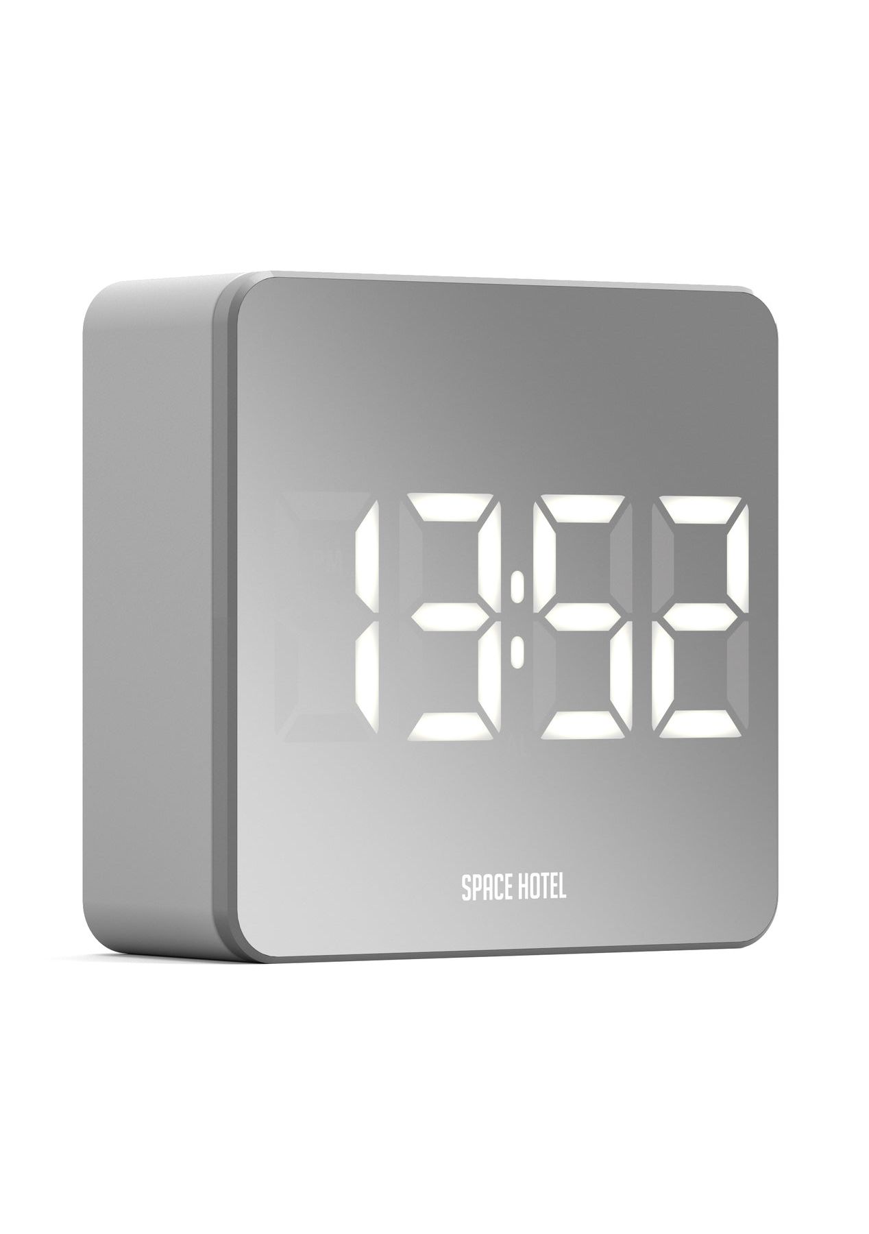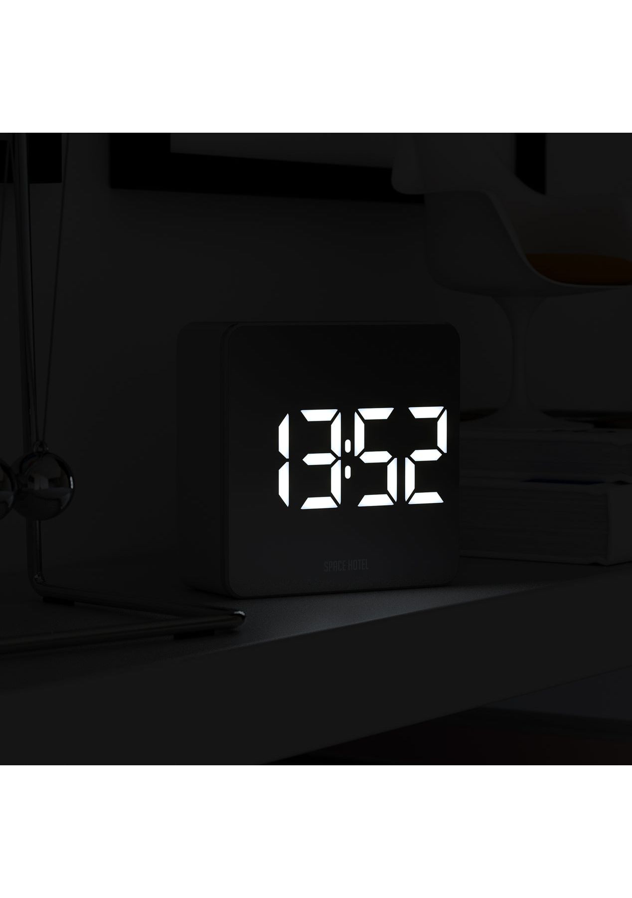 Newgate Space Hotel Orbatron Alarm Clock Black Case, Black Lens, Green Led The Orbatron is a small LED alarm clock in silver, or all-black colourway choices.This alarm clock is the perfect addition to the bedside with its sleek, modern square case and stand-out LED dial.- Designer LED clock with a bright display- 12 or 24-hour format- Night Screen brightness setting- Temperature display 0 to 50°C- USB power cable included- Size: HWD 10 x 10 x 4.7cm / 3.9 x 3.9 x 1.8in - Materials: Acrylic alarm clock, LED dial- Colour: Silver Case with White LED- Movement: Digital- Power: 1 x USB cable included, 3 x high-quality branded AAA batteries (not included), DC input 5V/500mA - 1000mA (not included) The time will display continuously only when connected to a power source with the included USB cable or a DC adaptor (not included). 3 x AAA batteries (not included) are required to retain time and alarm settings.