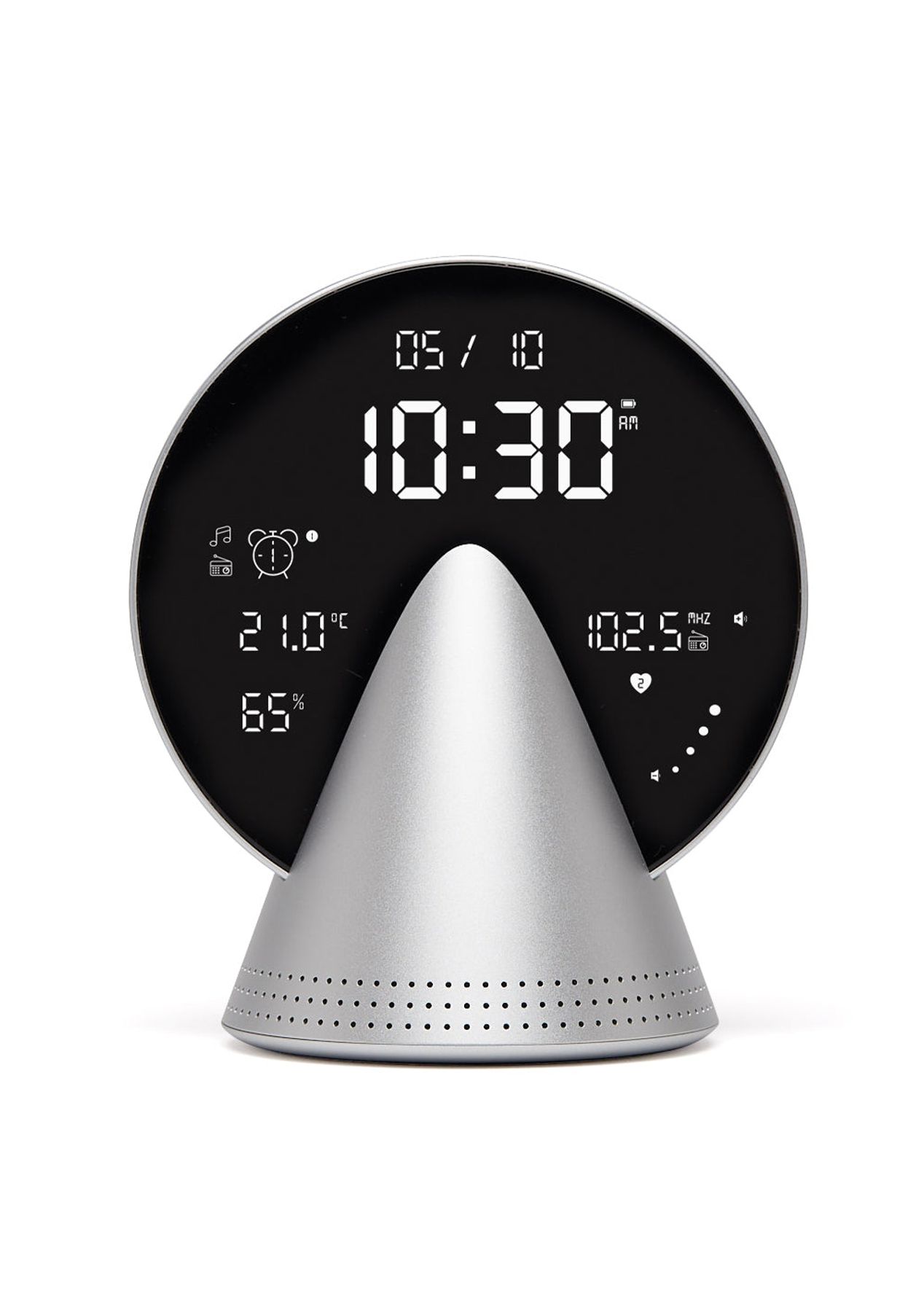 Lexon Conic Radio Alarm Clock With Fm & Built-In Bluetooth Speaker - Alu Polish - This versatile radio alarm clock features an FM radio and a built-in Bluetooth speaker, allowing you to wake up to your favourite FM station, soothing melodies, or natural sounds. It boasts a large LCD display with adjustable brightness for optimal visibility and includes an indoor temperature and relative humidity display for added convenience. The touch controls provide easy access to Bluetooth and FM radio modes, as well as device settings. Rechargeable and powered by a USB-C cable (included), this clock is crafted from durable aluminium and ABS materials. It is suitable for branding through laser or pad printing.- Radio alarm clock with FM & built-in Bluetooth speaker - Dual alarm with FM radio or melodies & natural sounds - Large LCD display - Adjustable brightness - Indoor temperature and relative humidity display - Touch controls for easy access to Bluetooth/FM radio modes and device settings - 2 alarms - Rechargeable - Powered by USB-C port (cable included) - Material: Aluminum - ABS. Suggested branding: laser - pad print.