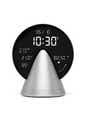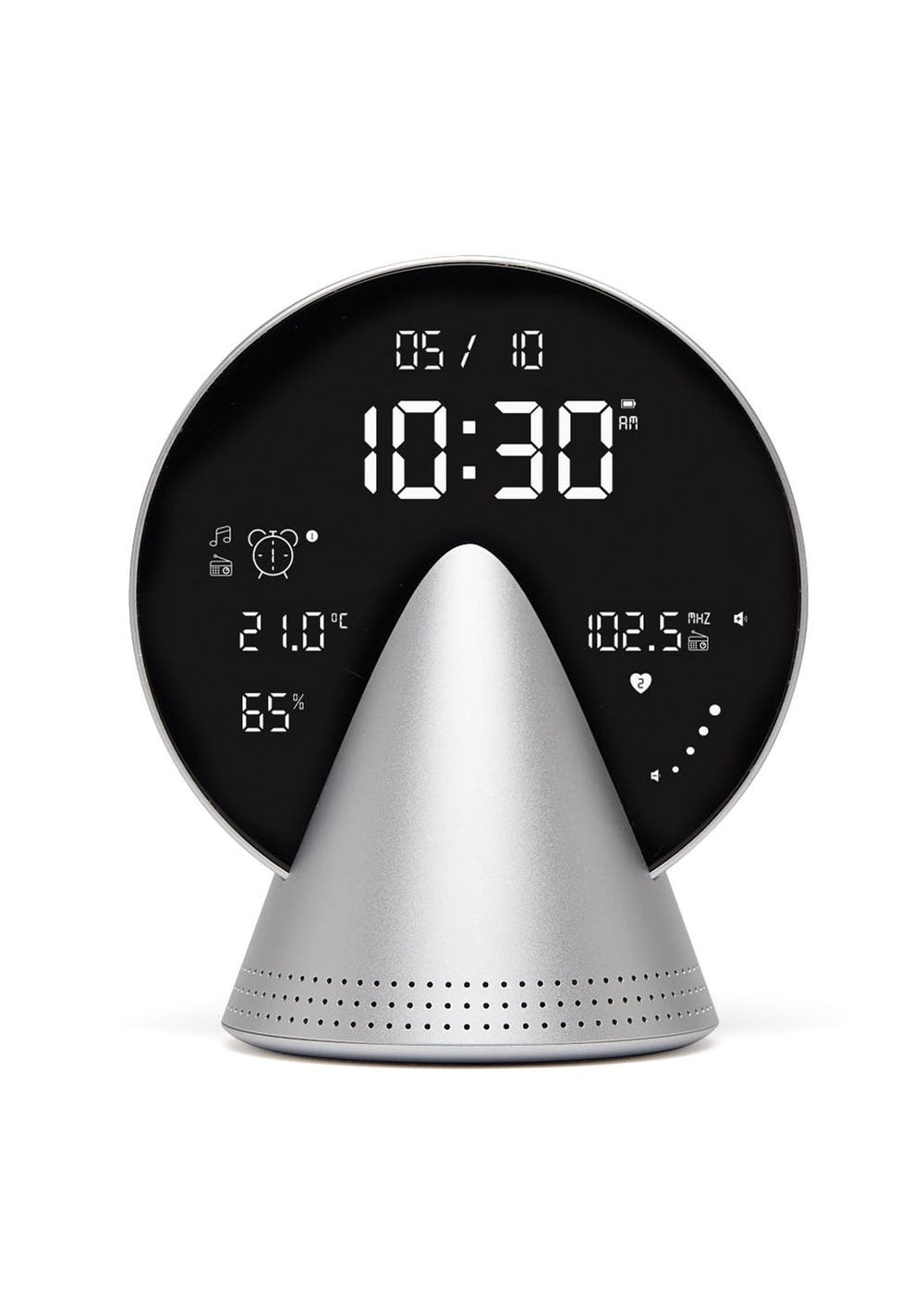 Lexon Conic Radio Alarm Clock With Fm & Built-In Bluetooth Speaker - Alu Polish - This versatile radio alarm clock features an FM radio and a built-in Bluetooth speaker, allowing you to wake up to your favourite FM station, soothing melodies, or natural sounds. It boasts a large LCD display with adjustable brightness for optimal visibility and includes an indoor temperature and relative humidity display for added convenience. The touch controls provide easy access to Bluetooth and FM radio modes, as well as device settings. Rechargeable and powered by a USB-C cable (included), this clock is crafted from durable aluminium and ABS materials. It is suitable for branding through laser or pad printing.- Radio alarm clock with FM & built-in Bluetooth speaker - Dual alarm with FM radio or melodies & natural sounds - Large LCD display - Adjustable brightness - Indoor temperature and relative humidity display - Touch controls for easy access to Bluetooth/FM radio modes and device settings - 2 alarms - Rechargeable - Powered by USB-C port (cable included) - Material: Aluminum - ABS. Suggested branding: laser - pad print.