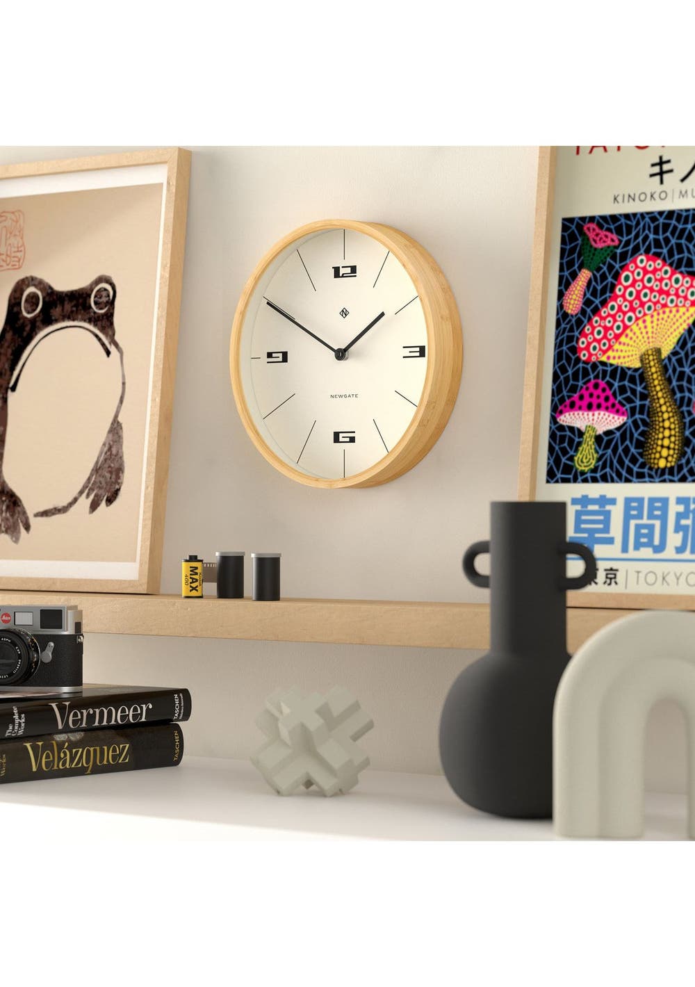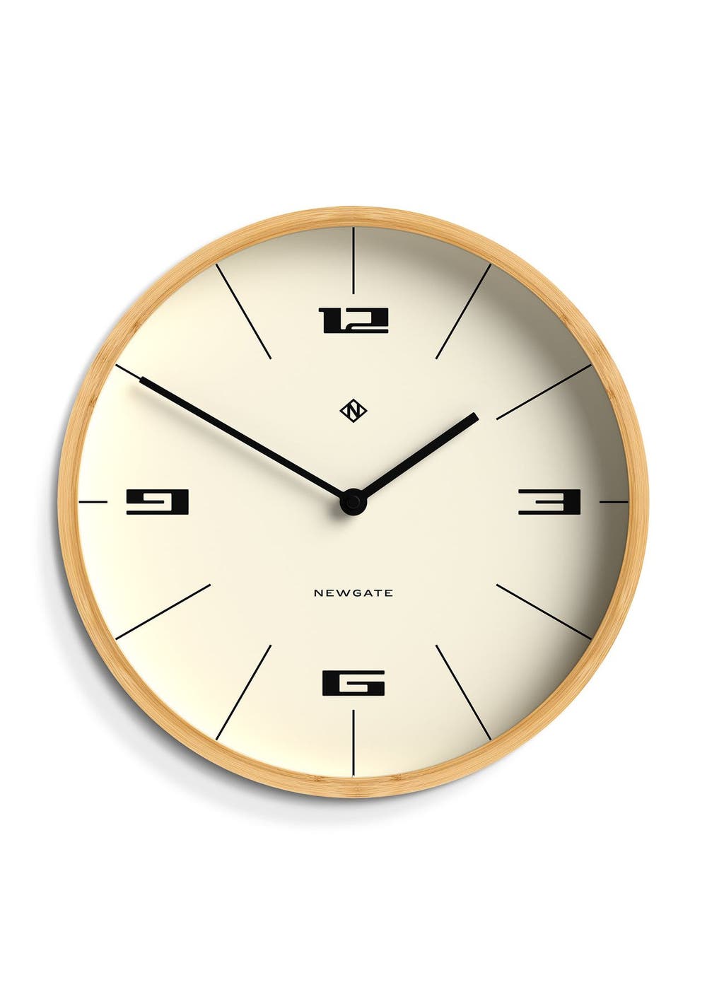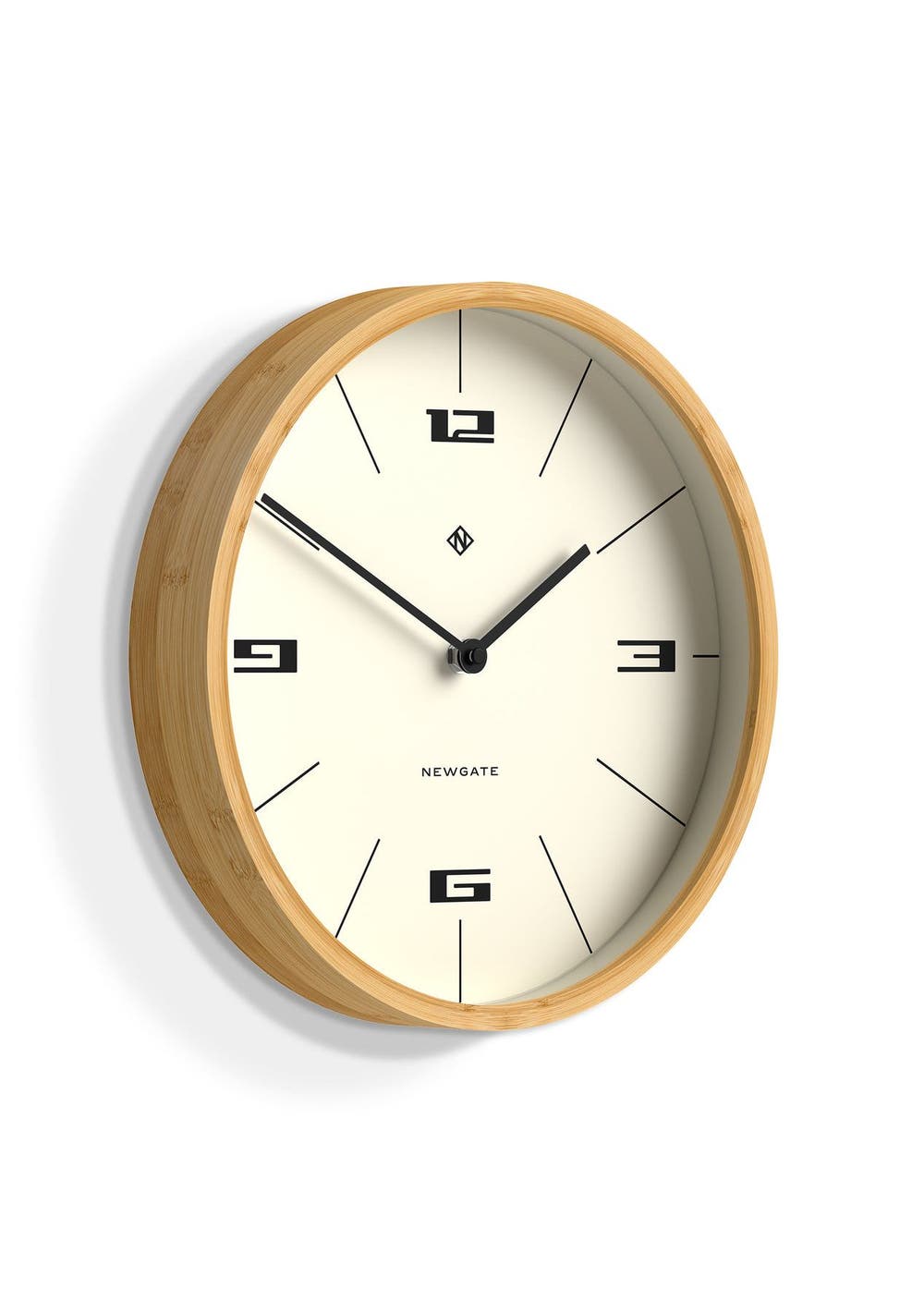 Newgate Bali Wall Clock Hovercraft Dial A modern wall clock with a bamboo case and a minimalist Scandi-inspired design combining functionality with beauty. This case comes with three dial options.Bamboo is highly renewable. Raw bamboo is converted, using the most fascinating process, into the solid blocks that we then turn into clock cases. Can you believe some species of bamboo grow up to an inch per hour! This medium wall clock creates a modern focal point in the kitchen, living room or office. Bamboo clock with metal hands and a glass lens. - Material: Bamboo, Metal, Glass- Colour: Cream w/ Bamboo- Movement: Quartz 'Silent Sweep'- Power: 1 x AA- Dimensions: LWH 30 x 30 x 5cm- Weight: 0.68kg