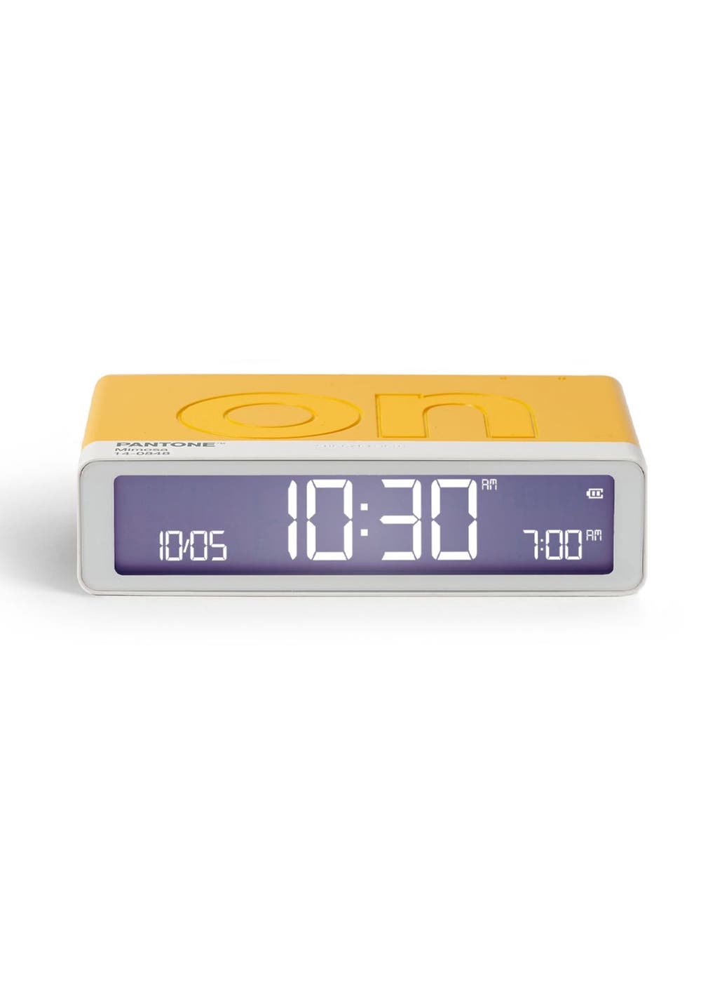 Lexon Flip Classic Reversible Alarm Clock PANTONE - Yellow - Fun and equipped with two faces (ON / OFF), the alarm clock must be turned down to be activated or deactivated with a simple gesture. Thanks to its integrated touch control, you just have to touch it to trigger the light of its LCD display. In addition, Flip Classic features some discreet buttons on its back to set the time/date format, alarm and screen brightness. Designed to be your ultimate bedside companion, Flip Classic boasts a 6-month battery life, rechargeable via USB-C. A battery indicator is visible on screen so you‚ll easily know when to recharge your device.‚ Reversible alarm clock‚ ON/OFF faces‚ LCD display‚ 3 Brightness levels‚ Touch sensor snooze / light‚ Rechargeable via USB-C (cable included)‚ Battery life: Up to 6 months‚ Charging time: 4h‚ Power supply: 5V USB power adapter (not included)
