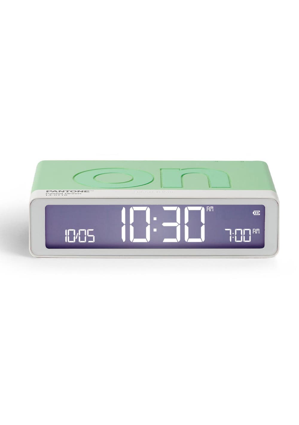 Lexon Flip Classic Reversible Alarm Clock PANTONE - Green - Fun and equipped with two faces (ON / OFF), the alarm clock must be turned down to be activated or deactivated with a simple gesture. Thanks to its integrated touch control, you just have to touch it to trigger the light of its LCD display. In addition, Flip Classic features some discreet buttons on its back to set the time/date format, alarm and screen brightness. Designed to be your ultimate bedside companion, Flip Classic boasts a 6-month battery life, rechargeable via USB-C. A battery indicator is visible on screen so you‚ll easily know when to recharge your device.‚ Reversible alarm clock‚ ON/OFF faces‚ LCD display‚ 3 Brightness levels‚ Touch sensor snooze / light‚ Rechargeable via USB-C (cable included)‚ Battery life: Up to 6 months‚ Charging time: 4h‚ Power supply: 5V USB power adapter (not included)