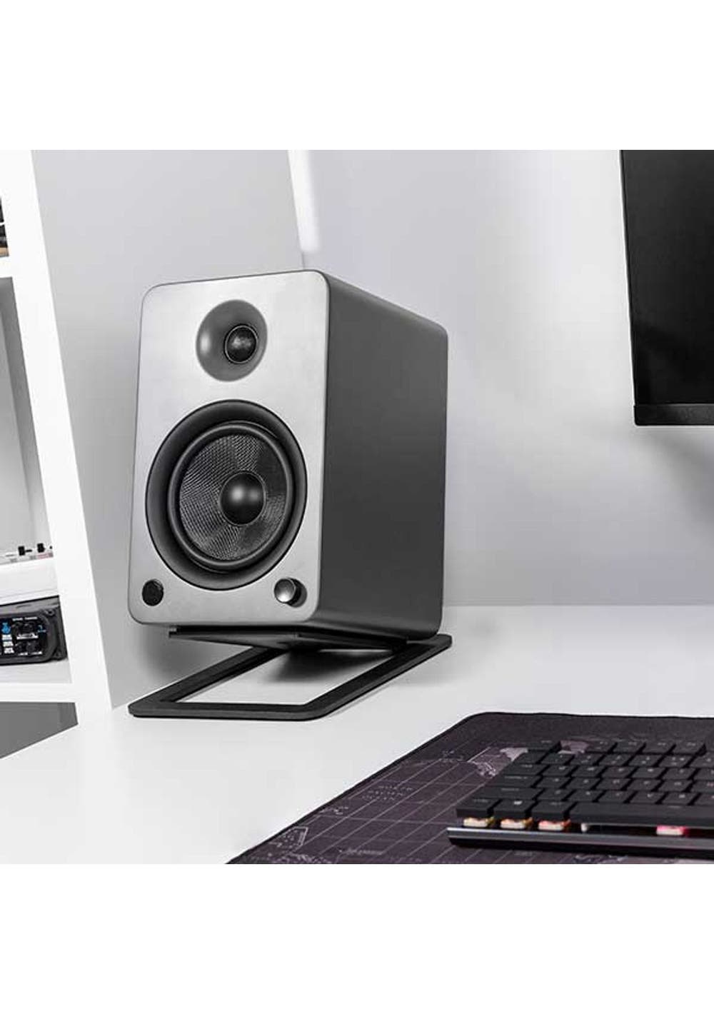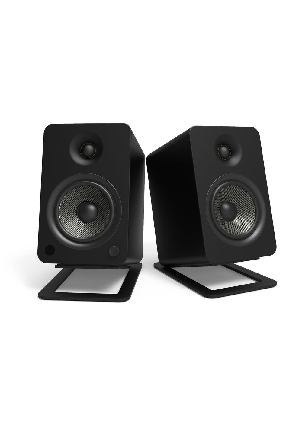 Improve the placement of your 4- to 7-inch speakers while maintaining a low-profile desktop setup. Providing 16¬∞ of tilt, S6 desktop speaker stands are designed to angle your speakers towards your ears, ensuring you experience the full range of frequencies they have to offer. Each stand features foam padding to reduce vibration when you have the sound cranked up, and includes a mounting hole and 1/4‚ù-20 screw to secure your YU6, TUK or other compatible speakers in place. IMPROVED SOUND - Due to their short wavelength, higher frequencies can easily go unheard unless directed towards your ears. S6 stands angle your speakers 16¬∞ upwards to ensure you capture every frequency they have to offer. GREATER STABILITY - Using the provided 1/4‚ù-20 screw, secure your YU6, TUK or other compatible speakers in place to prevent movement or accidental tipping. REDUCED VIBRATION - Closed cell foam padding on the top and bottom of each stand helps to isolate your speakers and reduce undesirable resonance, ensuring your sound remains clear and uncoloured. MINIMALISTIC DESIGN - Using as little material as possible, the low-profile design of S6 speaker stands helps to keep your desktop looking clutter-free. HIGH WEIGHT CAPACITY - Each stand is constructed out of 5mm solid steel in order to support up to 20 pounds. This also makes them extremely durable and resistant to vibration. Includes - 2 x Speaker Stands *Speakers Not Included