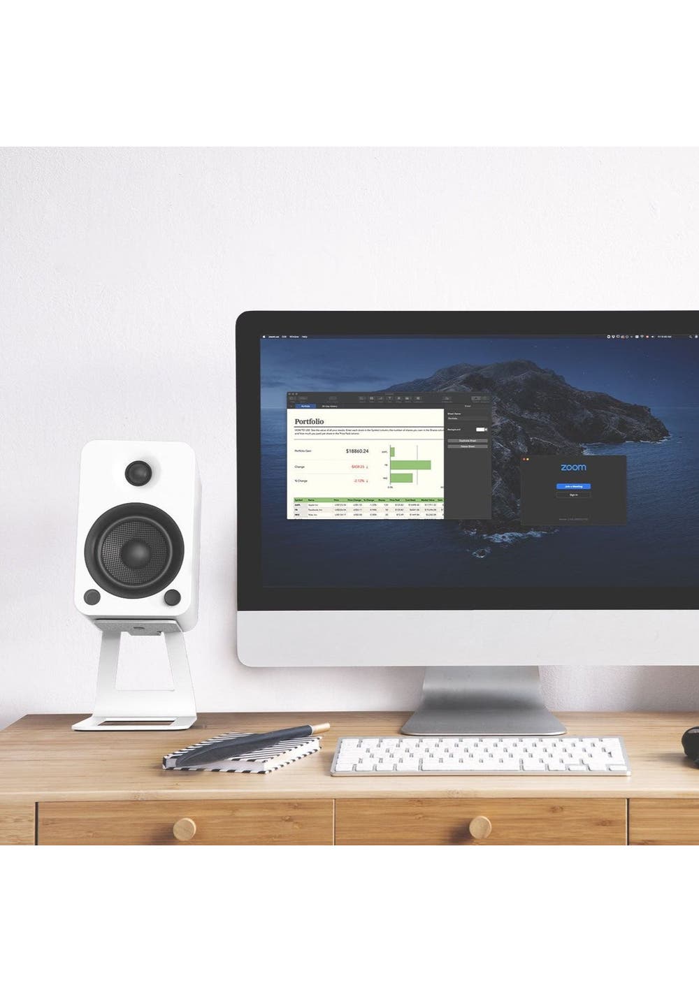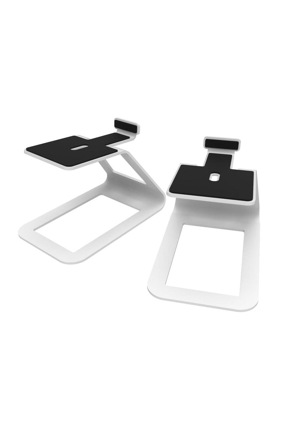 Kanto SE4W Elevated Desktop Speaker Stands for Midsize Speakers - Pair, White - Take your sound game to the next level with the SE4 Elevated Speaker Stand. Standing at a height of 5.6", the SE4 boosts your speakers up and off the surface of your desk so that they're better aligned with your ears to give you a flawless on-axis response. Its cantilevered and angled platform is designed to absorb resonance and deliver a pure sound without any reflections from nearby surfaces. 2.0mm of silicone padding provide a strong grip that helps keep your speakers and stand in-place. For maximum protection, the SE4 comes with a set of mounting screws that you can use to secure compatible speakers to the stand to prevent falls and accidents. The SE4 is available in both black and white and can hold up to 9 lbs. REDUCED RESONANCE. STELLAR SOUND QUALITY. - The SE4's cantilevered design and 2.0mm silicone padding absorbs resonance from the speaker cabinet to produce a clean, distortion-free sound. Use the included mounting screws to couple the speaker and stand together to increase the mass of your set-up and further reduce resonance. ACCURATE, ON-AXIS OUTPUT - Elevate and align your speakers with your ears so that you can enjoy flawless on-axis sound and prevent reflection from nearby surfaces. SAFE AND SECURE - 2.0mm of silicone speaker dampening offer a high grip to keep your speakers and stand firmly in place. Mounting screws are included to help you further secure compatible speakers to the stand. RECLAIM YOUR WORKSPACE - SE4's clean, clutter-free design is built so that you can place extra items directly below the speakers, maximising the utility of your desk surface and using the space normally taken up by traditional speakers. MINIMALIST DESIGN - Who says functional can't be beautiful? The SE4 stand boasts a minimal design that matches the style and colour of other Kanto accessories for a clean, consistent look. Available in a black or white finish. Includes 2 x Speaker Stands, 2 x Velcro Straps *Speakers Not Included