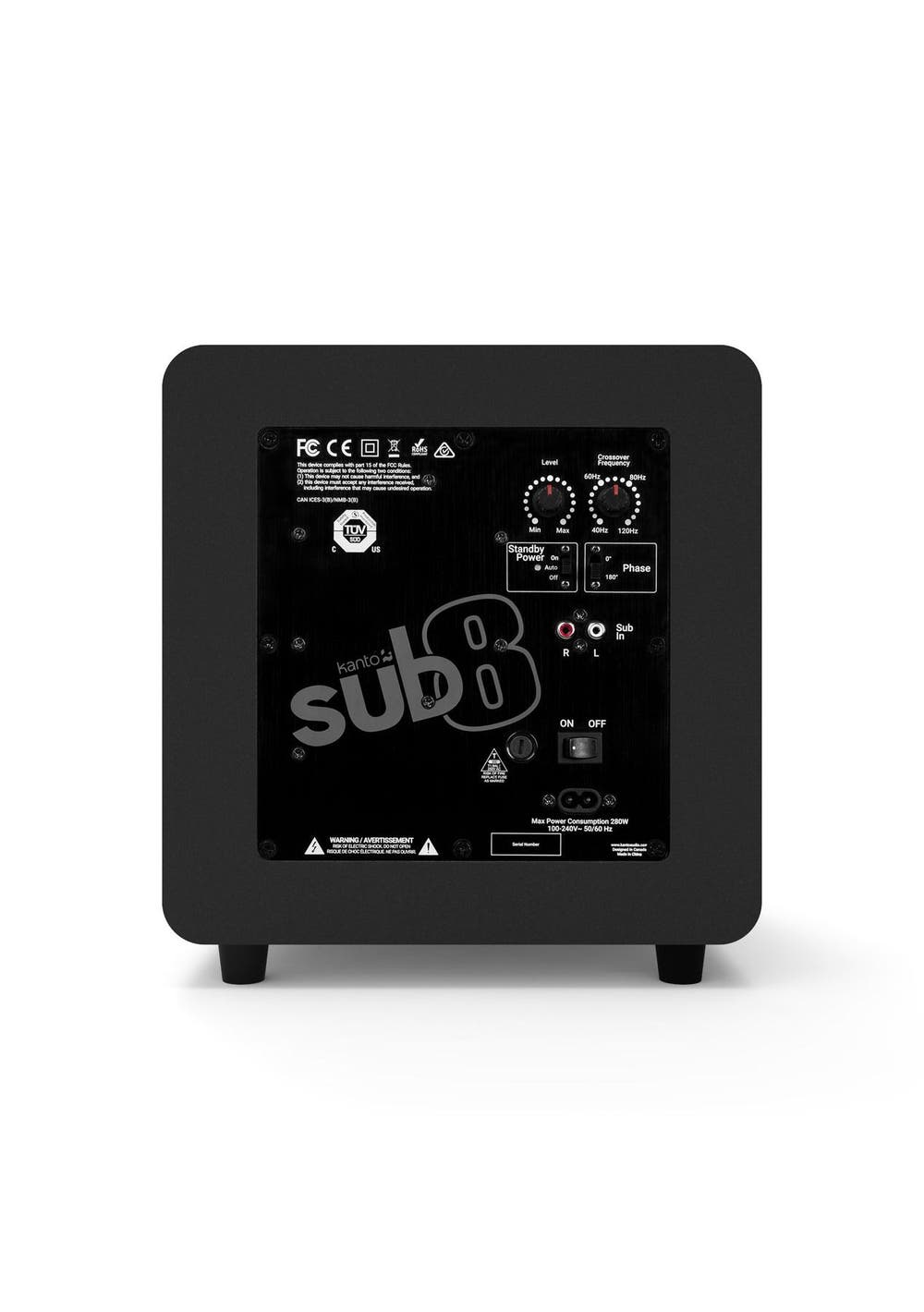 Kanto SUB8 300W 8" Sealed Powered Subwoofer, Matte Black - Sub8 gives you the speed and accuracy that only a sealed subwoofer can deliver. An 8‚ù woofer driven by a 300 W amp responds quickly to transients and keeps distortion to a minimum. Its compact size provides full-range sound without sacrificing floor space and a crossover filter and phase control allows for easy integration into any audio system. Sub8 provides worry-free longevity with its rigid MDF construction, solid rubber feet, metal grill, and durable vinyl finish. With matching aesthetics, sub8 is the perfect companion to any Kanto speaker or wherever else tight bass in a tight space is needed. SEALED ENCLOSURE - Sealed subwoofers react to changes in audio more quickly than vented designs. Every bass note is reproduced accurately with little distortion allowing you to hear pure audio and not the subwoofers‚ influence on the sound. COMPACT DESIGN ‚ At roughly 11‚ù in each direction, sub8 fits under desks or in the smallest of apartments where traditional home theatre subwoofers may dominate the space. DURABLE MATERIALS ‚ All materials used are designed for years of worry-free longevity. Never worry about moving or placing items on sub8 as it can take the rigours of everyday life. STUNNING LOOKS ‚ The simple, unfussy look of sub8 blends well into any decor and provides a cohesive look with Kanto speakers for unmatched aesthetics. EASY INTEGRATION ‚ The adjustable high-pass filter and phase switch lets you integrate sub8 into your audio system regardless of speakers being used ensuring you‚re not leaving performance on the table. TRUE BASS REPRODUCTION - Pumping out 300W of total peak power, sub8's sealed box design provides detailed bass response while ensuring your favourite songs and soundtracks are perfectly balanced. Includes - 1 x Subwoofer- Power Cord - RCA Cable- Manual