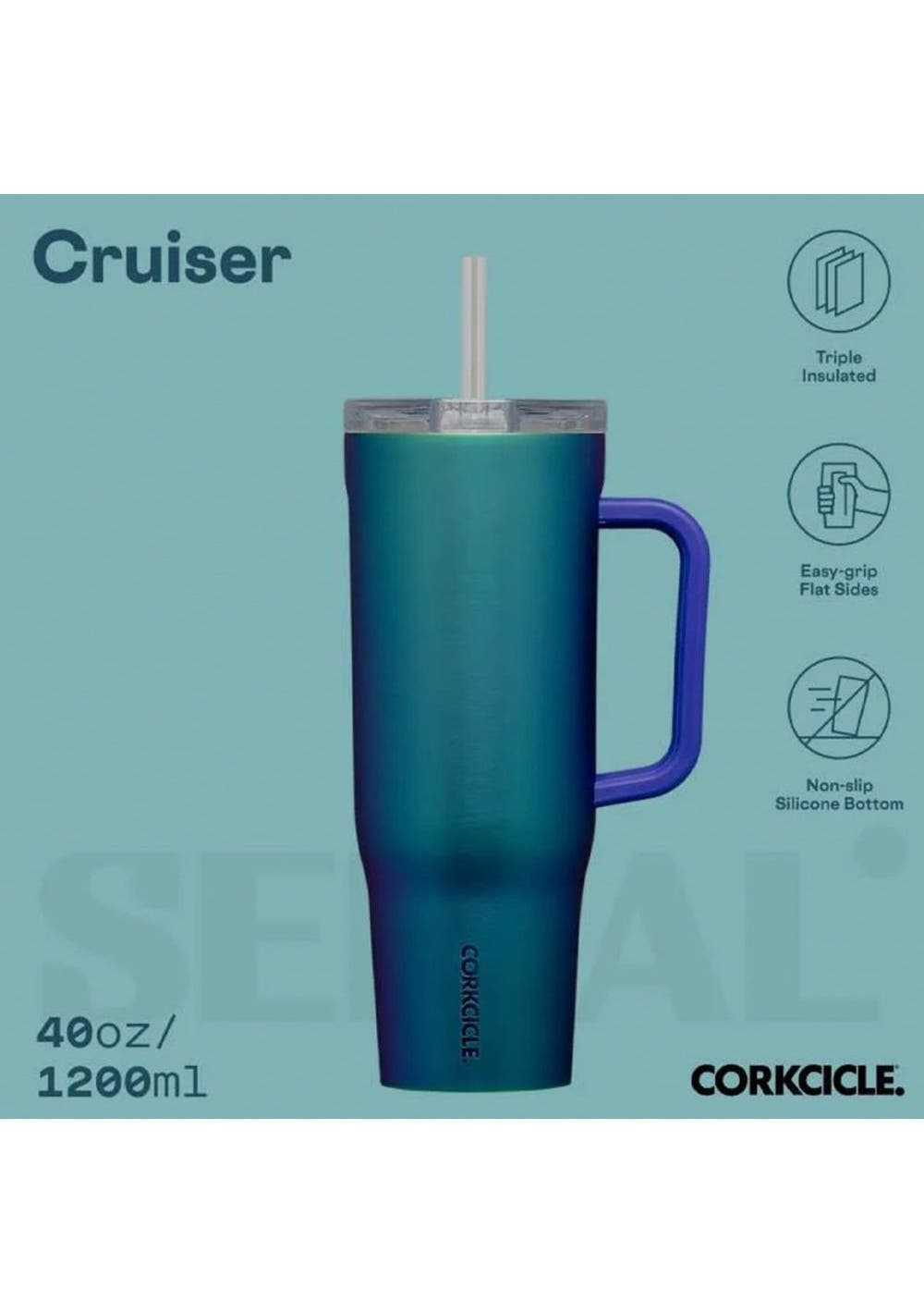 Corkcicle Cruiser - 1.2ltr Unicorn Magic. Hit the road, trail, or wherever the day takes you‚îhydrated and in style. The Cruiser is our biggest straw cup yet, holding 1.2L (40oz) of your favorite beverage and keeping it cold for up to 20 hours or hot for up to 9. Whether it‚s your daily commute or a weekend escape, Cruiser is designed for maximum comfort and minimal fuss. It features a spill-proof, dual-function lid for sipping or using the straw, a soft-grip handle for easy carrying, and a non-slip silicone bottom that stays sdy no matter how bumpy the ride. Key Features-Keeps beverages cold for up to 20 hours-Keeps beverages hot for up to 9 hours-Flat sides and ergonomic handle for a secure grip-Spill-proof sip + straw dual-function lid-Soft-touch comfort-grip handle-Stay-put, non-slip silicone bottom-Fits most cupholders-Durable triple-insulated stainless steel
