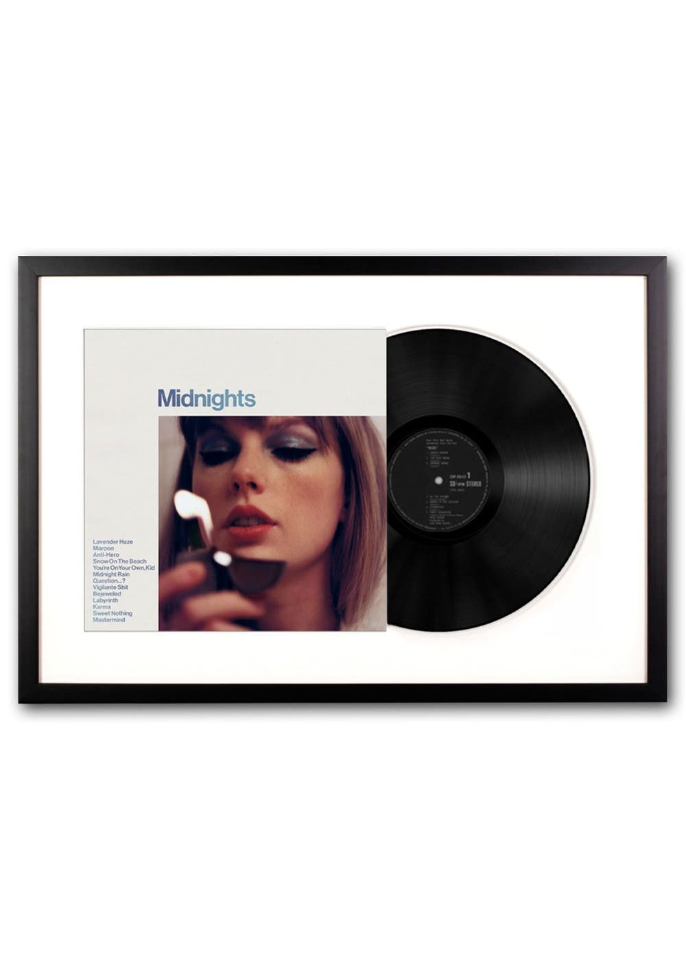 Framed Taylor Swift Midnights Vinyl Album Art - We are eager to honour and showcase this art form by framing the actual original artist's vinyl cover and vinyl record themselves. This record is framed using all wood profiles, archival matting, and UV-filtering non-glare acrylic. The cover artwork is presented in full, while the actual vinyl peeks out of the sleeve. The outer dimensions of each frame are 75 cm x 47.5 cm. Features - All Wood Profiles- Archival Matting- UV-Filtering Non-Glare Acrylic- Outer Framed Dimensions: 75 cm x 47.5 cm- Made to Order in Melbourne, Australia- Please Note: Avoid hanging framed album art in direct sunlight as the inks may be affected by moisture.