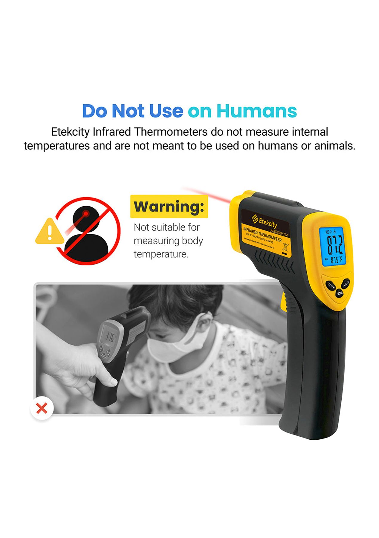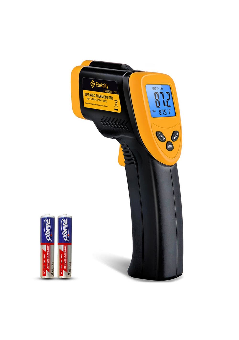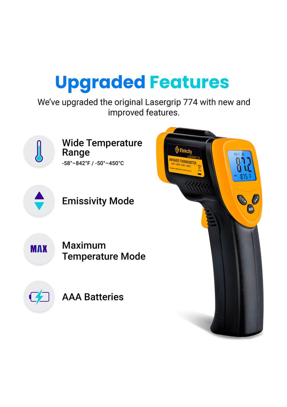 Etekcity Infrared Thermometer 774 - Introducing the ultimate tool for precise temperature measurements‚îthe Infrared Laser Thermometer Gun. This cutting-edge thermometer utilises thermopile sensor technology, ensuring remarkable accuracy of ¬±1.5%. Its adjustable emissivity feature allows for tailored measurements on various surface materials, while the ultra-fast response, with a ratio of 12:1 and a response time <500Ms, swiftly delivers readings even from considerable distances. Experience versatility with its wide temperature range of -50¬∞C‚550¬∞C, making it ideal for diverse applications like preparation, auto maintenance, and home repairs. The user-friendly design displays MAX/MIN/AVG temperatures from the last scan, making it perfect for AC vents or car engines. Featuring a backlit LCD screen, auto shut-off conserving battery life after 90 seconds of inactivity. Powered by AAA batteries, this thermometer ensures long-lasting performance. Please note, it's not intended for human body temperature measurement. Elevate your temperature measurement accuracy with this efficient and reliable infrared thermometer gun. Features;- Fast Reading System- Measurement Range: -50¬∞ to 450¬∞C - Consistent Accurate Reading- Resolution: 0.1 ¬∞C- Wavelength: 630‚670 nm- Distance-to-Spot Ratio : 12:1 - Response Time: < 500 ms- Emissivity: 0.1‚1.0 - Battery Powered: 2 x 1.5V AAA Batteries (Included) - Auto Shut Off in 15 secondsIncludes: - 1 x Lasergrip- 2 x 1.5V AAA Batteries (Pre-Installed)- 1 x User Manual