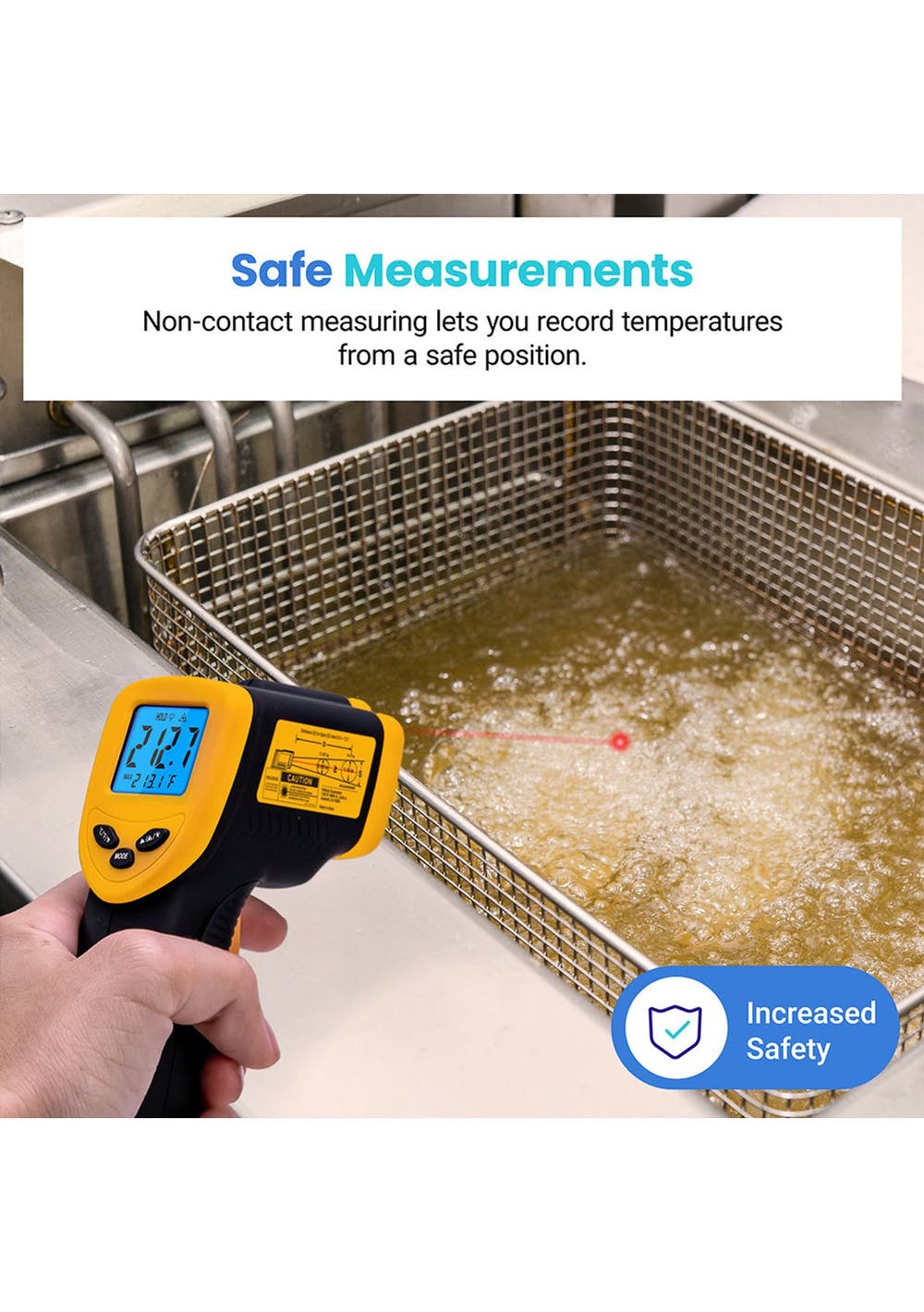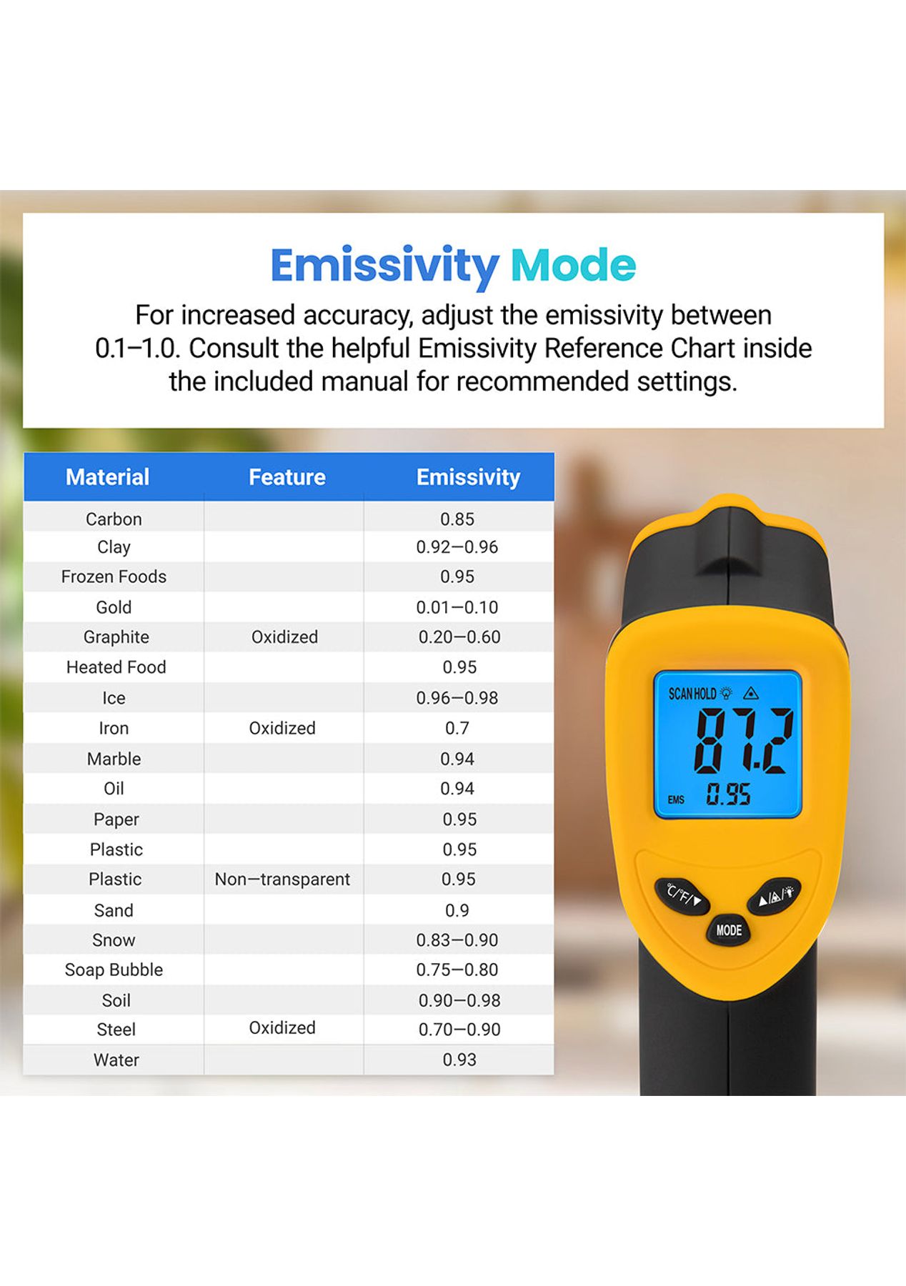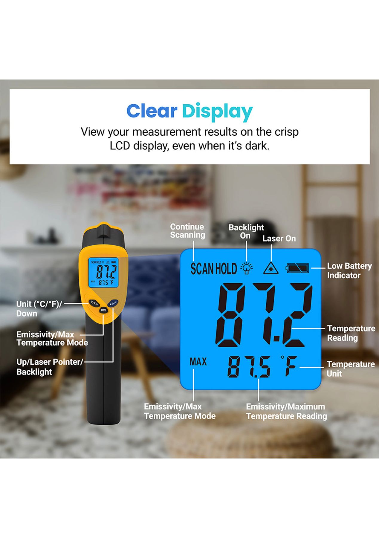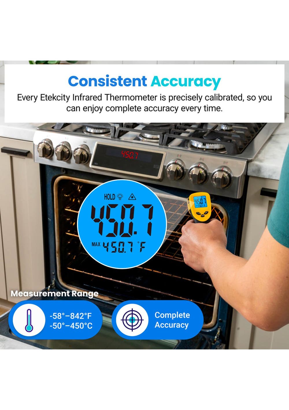 Etekcity Infrared Thermometer 774 - Introducing the ultimate tool for precise temperature measurements‚îthe Infrared Laser Thermometer Gun. This cutting-edge thermometer utilises thermopile sensor technology, ensuring remarkable accuracy of ¬±1.5%. Its adjustable emissivity feature allows for tailored measurements on various surface materials, while the ultra-fast response, with a ratio of 12:1 and a response time <500Ms, swiftly delivers readings even from considerable distances. Experience versatility with its wide temperature range of -50¬∞C‚550¬∞C, making it ideal for diverse applications like preparation, auto maintenance, and home repairs. The user-friendly design displays MAX/MIN/AVG temperatures from the last scan, making it perfect for AC vents or car engines. Featuring a backlit LCD screen, auto shut-off conserving battery life after 90 seconds of inactivity. Powered by AAA batteries, this thermometer ensures long-lasting performance. Please note, it's not intended for human body temperature measurement. Elevate your temperature measurement accuracy with this efficient and reliable infrared thermometer gun. Features;- Fast Reading System- Measurement Range: -50¬∞ to 450¬∞C - Consistent Accurate Reading- Resolution: 0.1 ¬∞C- Wavelength: 630‚670 nm- Distance-to-Spot Ratio : 12:1 - Response Time: < 500 ms- Emissivity: 0.1‚1.0 - Battery Powered: 2 x 1.5V AAA Batteries (Included) - Auto Shut Off in 15 secondsIncludes: - 1 x Lasergrip- 2 x 1.5V AAA Batteries (Pre-Installed)- 1 x User Manual
