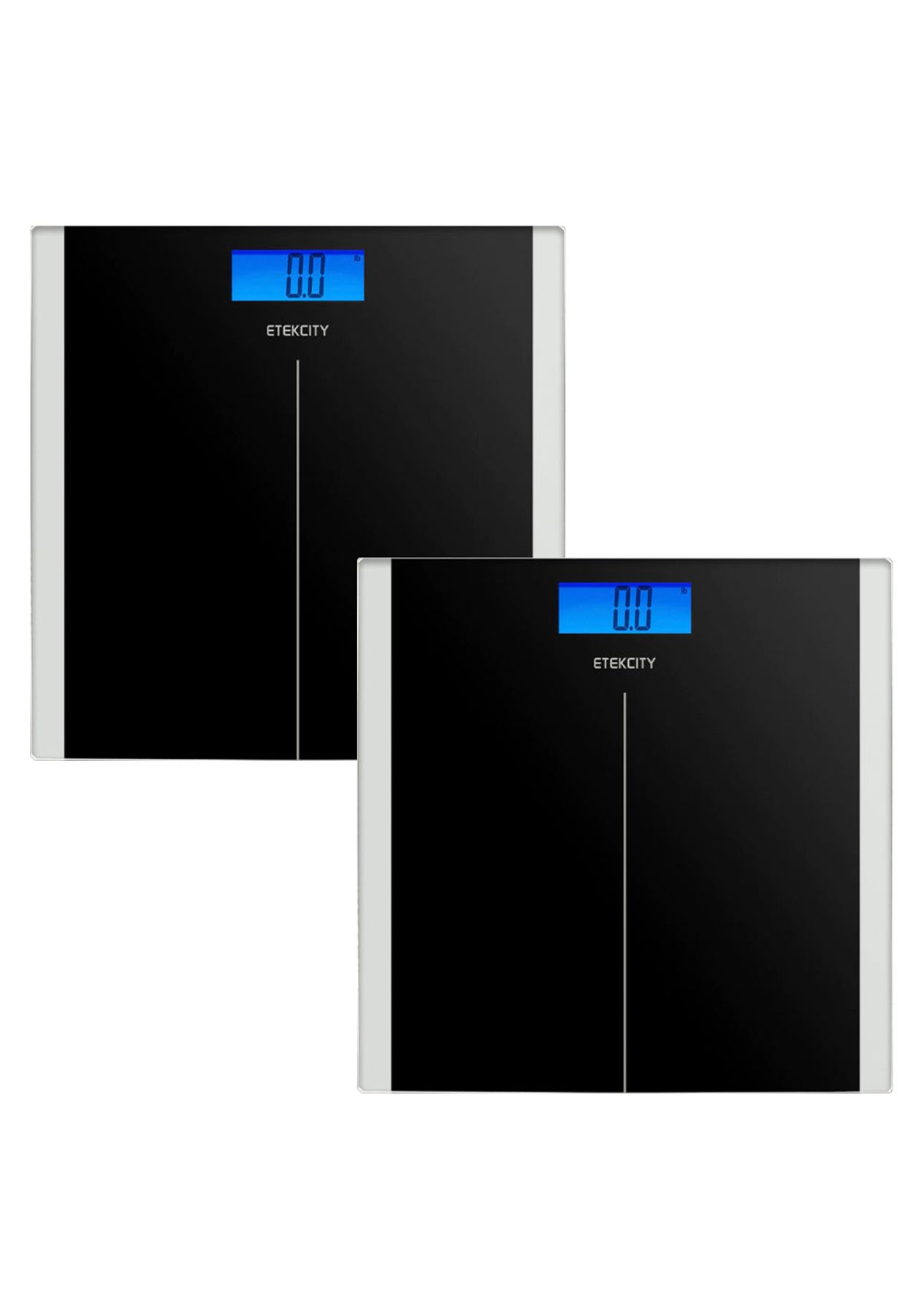 Etekcity Digital Body Weight Bathroom Scale - Black - 2 Pack Staying fit and healthy is just a step away This scale is auto-calibrated, so you simply step on its large tempered glass platform and receive immediate results displayed on a sizeable backlit LCD display. Sophisticated sensors ensure that your results are within 0.2 lbs. of whatever is being weighed, ensuring accurate weight measurement time after time. Please note:1. For best accuracy, please lay the digital bathroom scale on hard and flat surface, and stand on the central area. Avoid carpet or soft surface.2. To avoid inaccurate weight results, please re-calibrate the scale after physically moving or shifting it or when replacing the batteries.3. To calibrate, apply weight on the scale, then step off and wait 10-15 seconds for the LCD screen to display "0.0". Then, step back on the scale to weigh with accurate results.4. Body weight naturally fluctuates throughout the day. People are lighter when they wake up, heavier in the middle of the day, and lighten again toward the end of the day.5. This scale was designed for measuring weights of at least 11 lb. For lighter objects, we suggest an Etekcity Kitchen Scale. Features- Etekcity Body Weight Scale- Weight: 180kg (400lbs)- Weight Units: lb / kg- Automatic Multifunction for Low Battery/Overload Indication- Auto On/Off- LCD Display- Platform: 6mm Tempered Glass- Battery: 2 x 1.5V AAA batteries- Product dimensions: ‚é 29.97 x 29.97 x 2.03 cm; 1.8kgIncludes- 2 x Body Weight Scale- 2 x User Manuals
