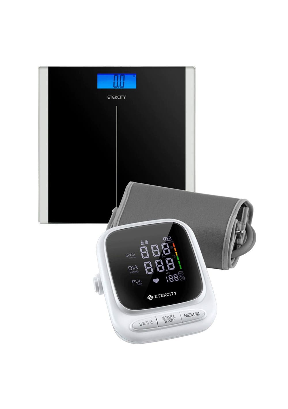 The Etekcity Digital Body Weight Bathroom Scale in black bundled with the Etekcity Smart Blood Pressure Monitor is the perfect wellness starter pack. Staying fit and healthy is just a step away This scale is auto-calibrated, so you simply step on its large tempered glass platform and receive immediate results displayed on a sizeable backlit LCD display. Sophisticated sensors ensure that your results are within 0.2 lbs. of whatever is being weighed, ensuring accurate weight measurement time after time. Additionally, the bundled Etekcity Blood Pressure Monitor for home use is highly accurate and reliable. Features a large LED screen that's easier to read than other arm or wrist machines on the market as well as a portable USB-C charging cable, so you can take it on the go. The blood pressure cuff is ideal for home use and makes measuring blood pressure easier than ever. Please note:1. For best accuracy, please lay the digital bathroom scale on hard and flat surface, and stand on the central area. Avoid carpet or soft surface.2. To avoid inaccurate weight results, please re-calibrate the scale after physically moving or shifting it or when replacing the batteries.3. To calibrate, apply weight on the scale, then step off and wait 10-15 seconds for the LCD screen to display "0.0". Then, step back on the scale to weigh with accurate results.4. Body weight naturally fluctuates throughout the day. People are lighter when they wake up, heavier in the middle of the day, and lighten again toward the end of the day.5. This scale was designed for measuring weights of at least 11 lb. For lighter objects, we suggest an Etekcity Kitchen Scale. Features- Etekcity Body Weight Scale- Weight: 180kg (400lbs)- Weight Units: lb / kg- Automatic Multifunction for Low Battery/Overload Indication- Auto On/Off- LCD Display- Platform: 6mm Tempered Glass- Battery: 2 x 1.5V AAA batteries- Product Dimensions: ‚é 29.97 x 29.97 x 2.03 cm; 1.8kg Blood Pressure Monitor- Automatic Shut-off (Approx. 60 seconds)- Advantages: Accurate Result, Comfortable Large Cuff- Battery Powered: 4 x 1.5v AAA Batteries (Charges in 3‚4 hours)- Measurement Range Pressure: 0‚290 mmHg / 0‚39 kPa (Units: mmHg / kPa)- Pulse: 40‚199 per minute- Accuracy Pressure: ¬±3 mmHg / ¬±0.4 kPa, Pulse: ¬±5%- Dimensions Monitor: 4.9 x 4.5 x 2.8 in / 12.6 x 11.5 x 7.1 cm- Cuff Circumference: 8.7‚16.5 in / 22‚42 cm- Lightweight at 1.29 lb / 487 g- Operating Environment Temperature: 41¬∞‚104¬∞F / 5¬∞‚40¬∞C- Relative Humidity: 15‚80%- Battery Type 3.7V, 800mAh Li-ion Battery- Input Type-C USB 5V 1A Includes: 1 x Blood Pressure Monitor, 1 x Arm Cuff, 1 x Type-C USB Charging Cable, 1 x Storage Bag, 1 x Manual, 1 x Quick Start Guide, 1 x Body Weight Scale, 1 x Manual