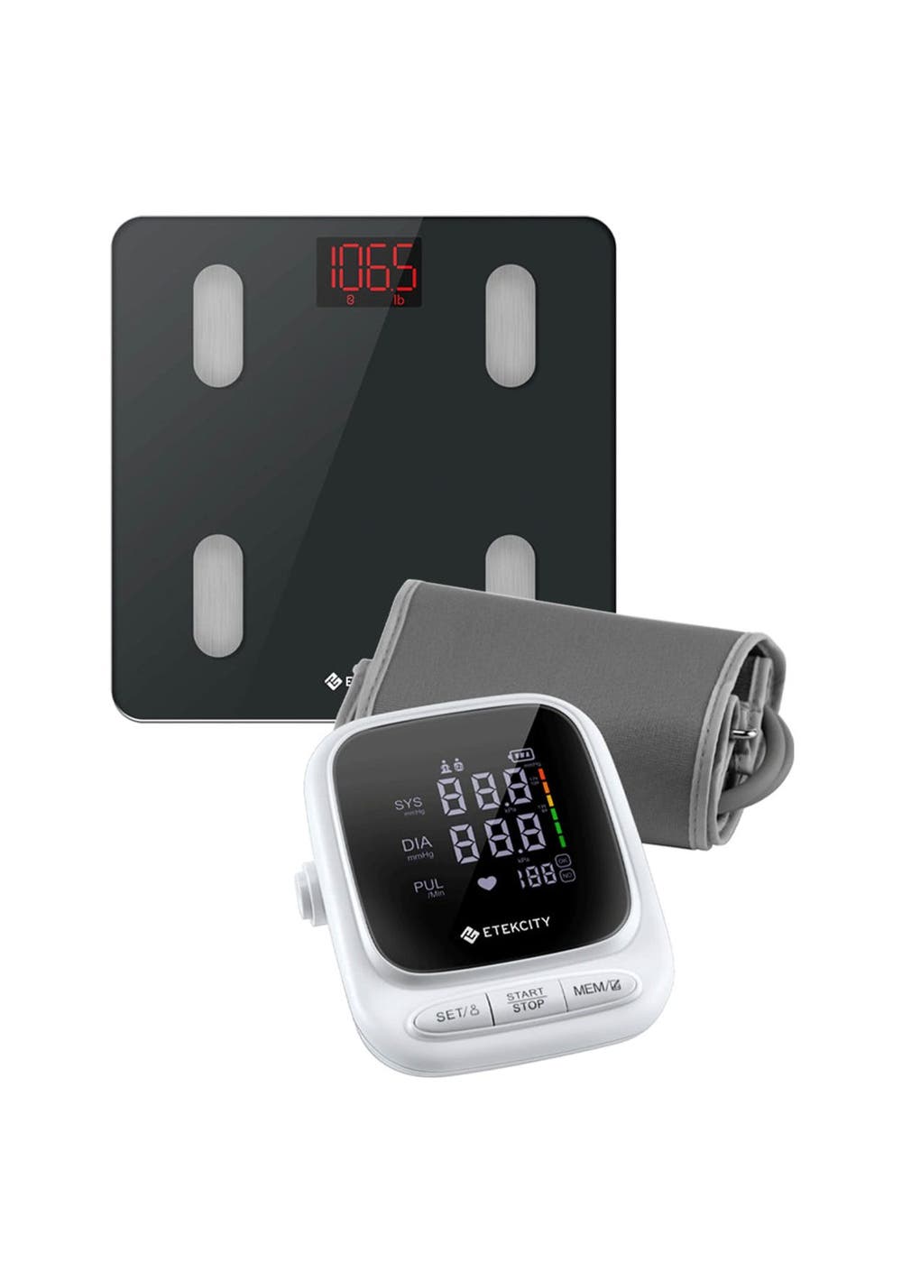 The bundled Etekcity Smart Scale for Body Weight with the Smart Blood Pressure Monitor is the ideal wellness starter pack. Experience the future of fitness tracking with Etekcity's Smart Scale. Effortlessly monitor your progress and achieve your health goals with a user-friendly, digital scale that guarantees accuracy. With a generous capacity of 400 lb / 180 kg / 28 st, this scale accommodates diverse needs with precise 0.05 kg increments. Designed for convenience, the scale's sleek 30 x 30 cm slim design makes it a seamless fit in any space. The clear LED display (7.4 x 3.3cm) offers easy readability, enhancing your monitoring experience. Seamlessly sync your data via the VeSync App, providing you with a comprehensive overview of 13 different health metrics. Additionally, the bundled Etekcity Blood Pressure Monitor for home use is highly accurate and your reliable companion for effortless health management. Features a large LED screen that's easier to read than other arm or wrist machines on the market as well as a portable USB-C charging cable, so you can take it on the go. The blood pressure cuff is ideal for home use and makes measuring blood pressure easier than ever.Features- Smart Scale for Body Weight: - Smart Scale- Capacity & Units: 400 lb / 180 kg / 28 st- Increments: 0.1 lb / 0.05 kg- Dimensions: 30 x 30 cm- LED Display ( 7.4 x 3.3 cm)- Sync via VeSync App- 13 Different Health Metric Data- Power: 3 x 1.5V AAA (not included)- Bluetooth Connectivity- Compatible with Apple Health Blood Pressure Monitor:- Automatic Shut-off (Approx. 60 seconds)- Advantages: Accurate Result, Comfortable Large Cuff- Battery Powered: 4 x 1.5v AAA Batteries (Charges in 3‚4 hours)- Measurement Range Pressure: 0‚290 mmHg / 0‚39 kPa (Units: mmHg / kPa)- Pulse: 40‚199 per minute- Accuracy Pressure: ¬±3 mmHg / ¬±0.4 kPa, Pulse: ¬±5%- Dimensions Monitor: 4.9 x 4.5 x 2.8 in / 12.6 x 11.5 x 7.1 cm- Cuff Circumference: 8.7‚16.5 in / 22‚42 cm- Lightweight at 1.29 lb / 487 g- Operating Environment Temperature: 41¬∞‚104¬∞F / 5¬∞‚40¬∞C- Relative Humidity: 15‚80%- Battery Type 3.7V, 800mAh Li-ion Battery- Input Type-C USB 5V 1A Includes: - 1 x Blood Pressure Monitor- 1 x Arm Cuff- 1 x Type-C USB Charging Cable- 1 x Storage Bag- 1 x Manual- 1 x Quick Start Guide- 1 x Body Weight Scale- 1 x Quick Start Guide