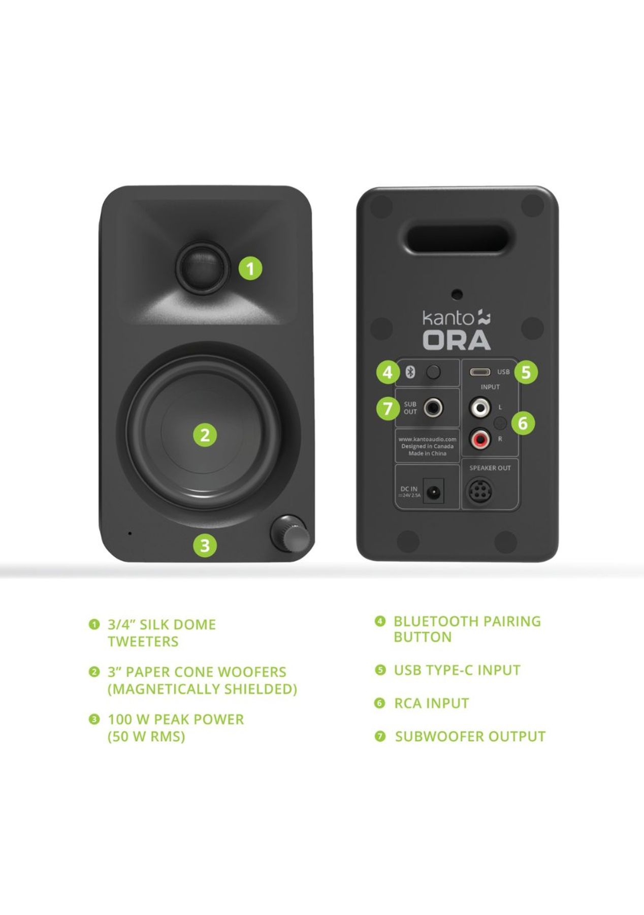 Kanto ORA 100W Powered Reference Desktop Computer Speakers - Everything a desktop speaker should be. Creator. Gamer. Musician. ORA bridges the gap between computer speakers and studio monitors giving you studio-grade, audiophile-approved sound without dominating your space. ORA has modern inputs like USB-C to get the best sound from your PC or Mac, Bluetooth 5.0 to pair with your phone or smart home device, and RCA for your analog gear. Sporting a crossover that automatically sends bass to a connected subwoofer, you get flawless low-end integration freeing up the 3‚ù woofers and ¬æ‚ù silk dome tweeters to focus on what they do best. ORA is the perfect blend of reference-quality sound and modern features at a compact size to fit on your desktop. - STUDIO GRADE SOUND: Offers audiophile-approved sound, utilising ¬æ‚ù silk dome tweeters and 3‚ù paper cone woofers for precise, high-fidelity audio across a wide frequency range (70 Hz ‚ 22 kHz). - VERSATILE CONNECTIVITY: Supports USB-C for optimal PC or Mac sound, Bluetooth 5.0 for phone or smart device pairing, and RCA inputs for analog gear. Includes an automatic crossover for flawless bass integration and freeing up tweeters and woofers for enhanced performance. - POWERFUL AMPLIFICATION: Class D bi-amplification with 100W peak power (50W RMS total), distributing 9W RMS per tweeter and 16W RMS per woofer, ensuring clear and powerful sound output. - COMPACT DESIGN: Perfectly blends reference-quality sound and modern features in a compact size that fits seamlessly on a desktop. Each speaker measures 3.9‚ù W x 5.6‚ù D x 6.9‚ù H, with a threaded rear mounting hole for flexible placement options. - COMPLETE PACKAGE: Includes essential accessories such as a 4-pin speaker connector (6‚), power cord, rubber feet, and a manual for convenient setup, allowing users to start enjoying high-quality sound immediately.