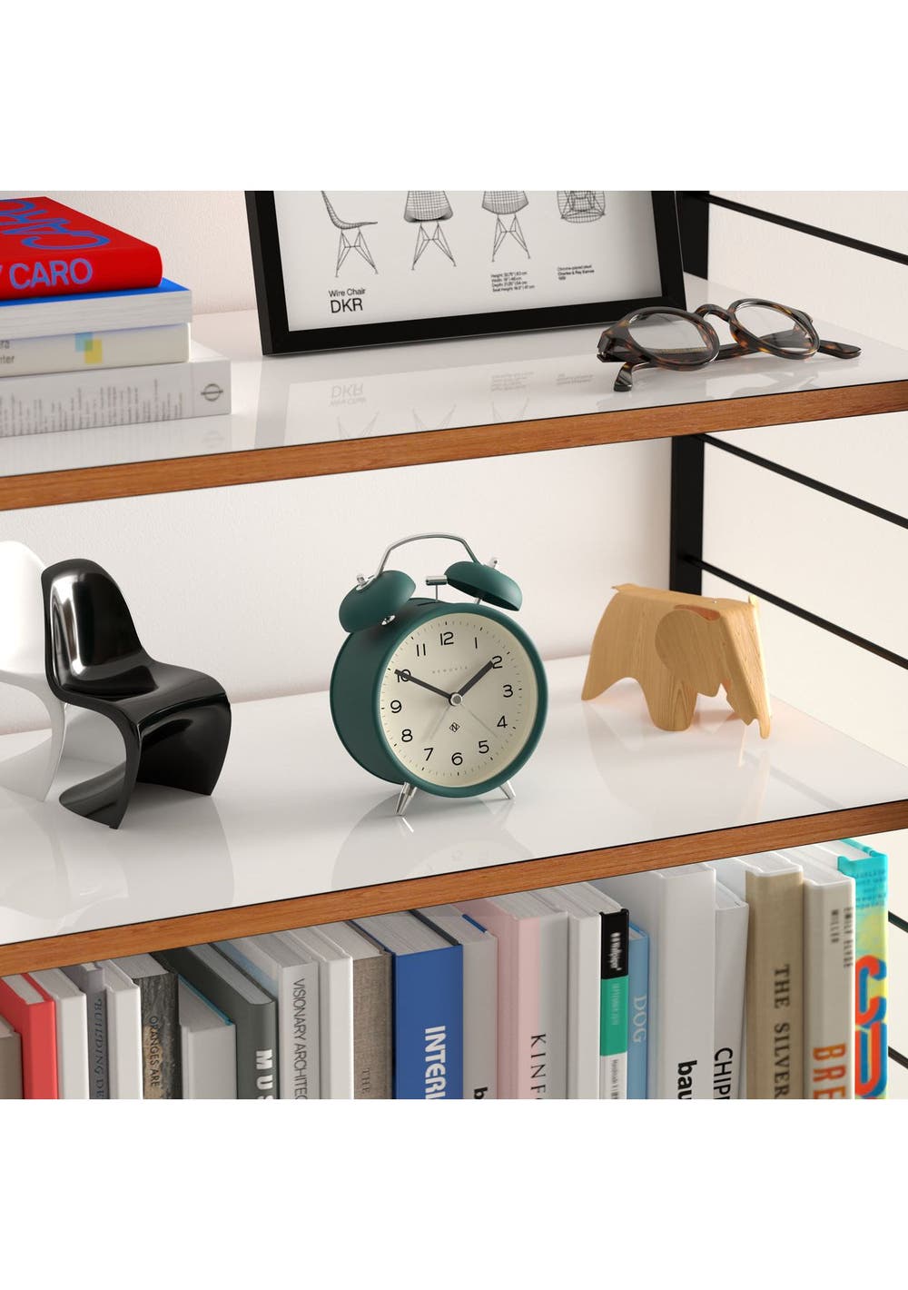 An 'Eden' Green Charlie Bell Alarm Clock with a colourful modern matt-finish case, contemporary graphic dial and a moving hammer and twin-bell alarm.Known as ‚silent sweep‚ in the industry, the hands move in a constant sweeping motion rather than a stepped tick. So you won‚t hear any ticking but if your hearing is particularly sensitive in a completely silent room you may hear a very quiet whirring.Ideal for adding a pop of colour to the desk, mantelpiece or shelves, the Echo alarm clock coordinates with our Eden Green mantel clock and Eden Green wall clock. - Material: Metal, Acrylic, Paper, Glass- Colour: Eden Green- Movement: Quartz- Power: 1 x AA (not included)- Dimensions: LWH 5.5 x 9.8 x 13.5cm- Weight: 0.22kg