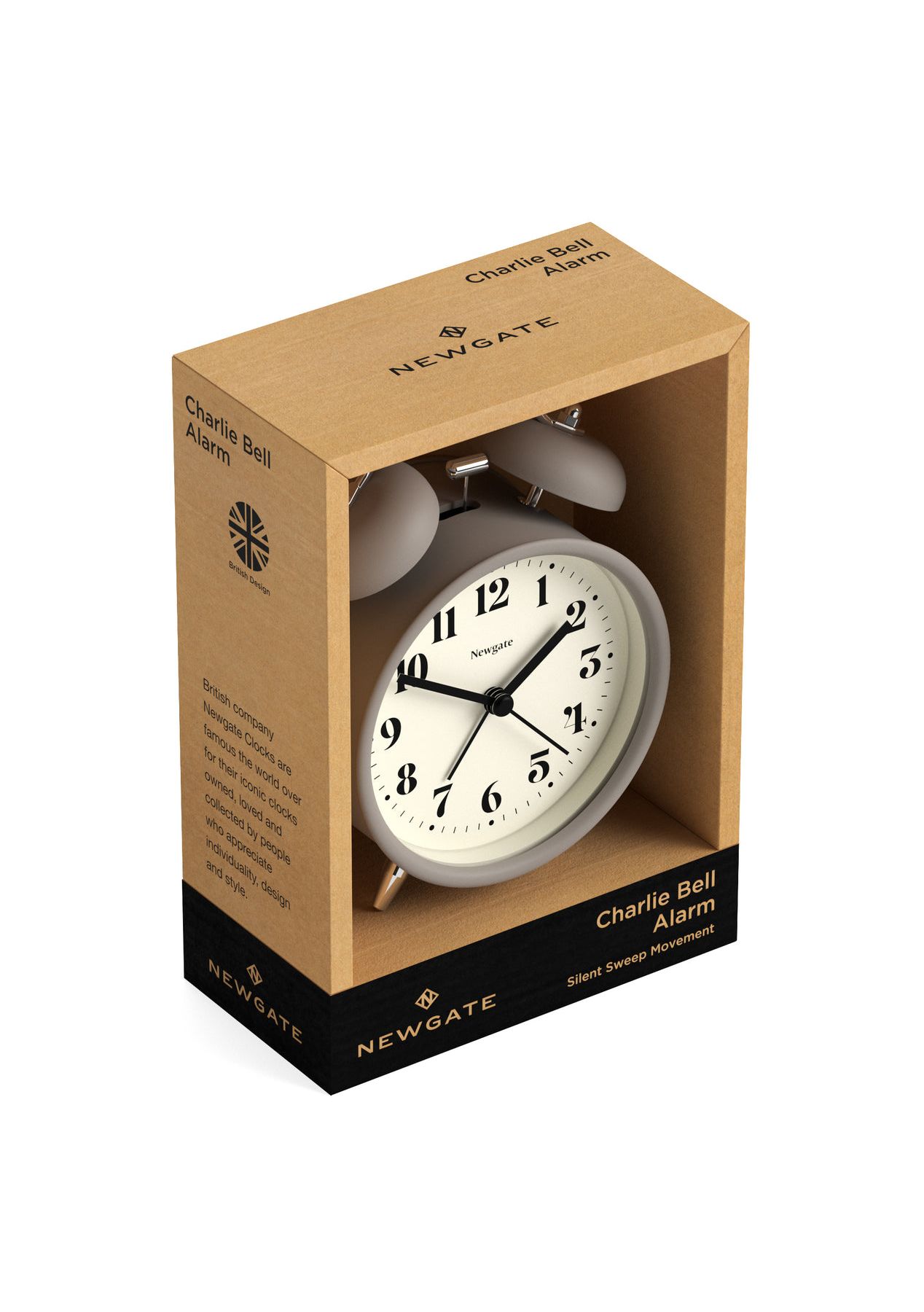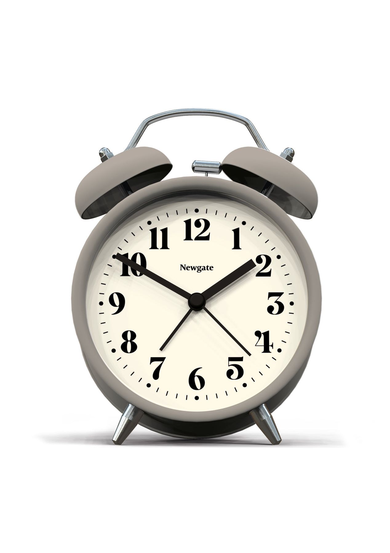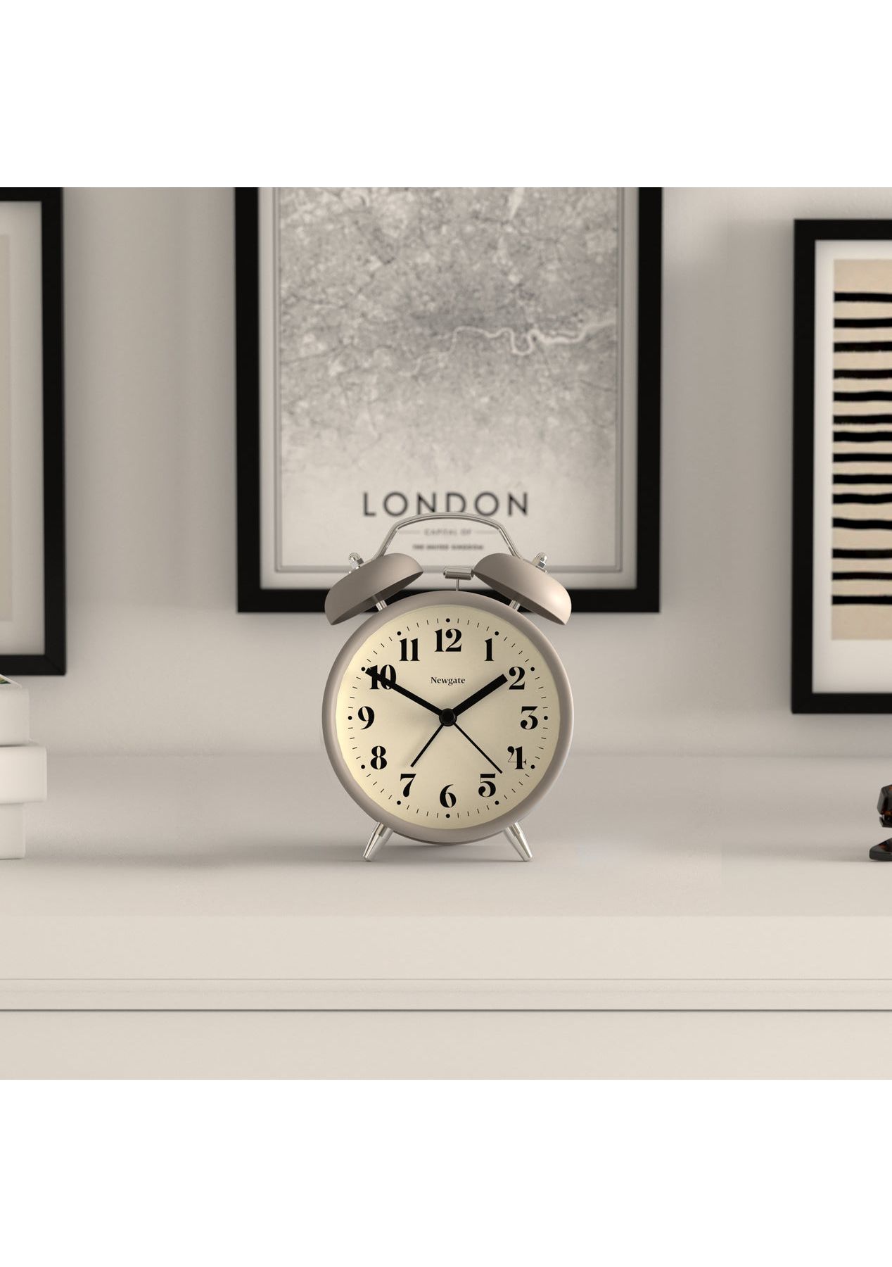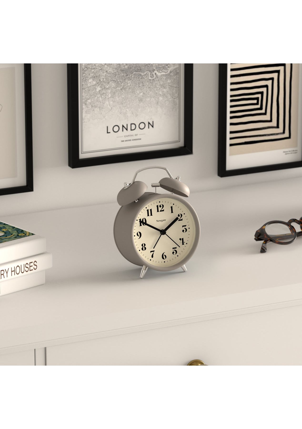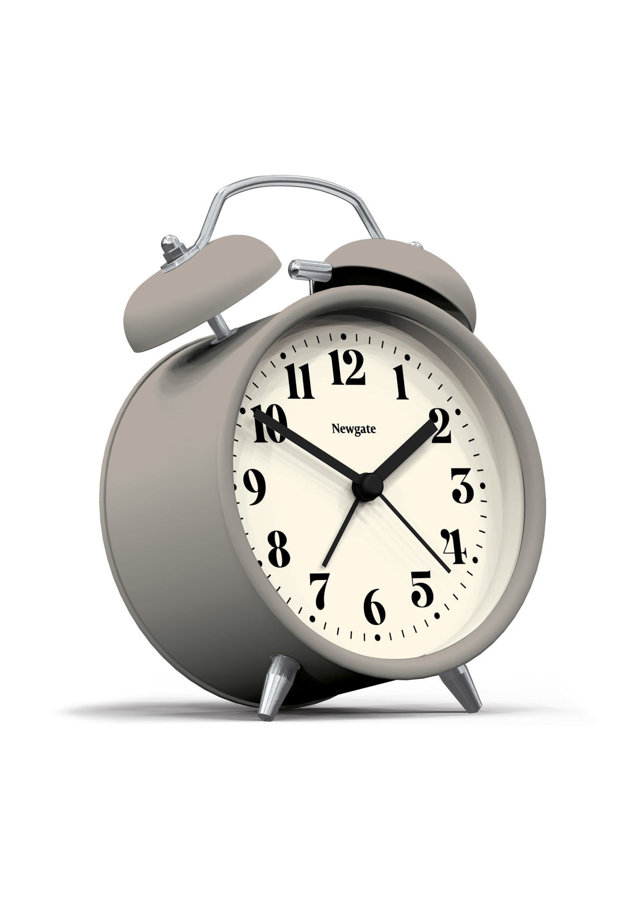 The Theatre Alarm Clock in a Matt Stone finish, contemporary graphic dial and a moving hammer and twin-bell alarm.Known as ‚silent sweep‚ in the industry, the hands move in a constant sweeping motion rather than a stepped tick. So you won‚t hear any ticking but if your hearing is particularly sensitive in a completely silent room you may hear a very quiet whirring. - Size: HWD 13 x 9.5 x 5.5cm / 5.1 x 3.7 x 2.2in - Materials: Metal and Glass- Colour: Matt Stone- Movement: Quartz ‚Silent-Sweep‚ Movement (No tick)- Power: Requires 1 x high quality branded alkaline AA battery (not included)
