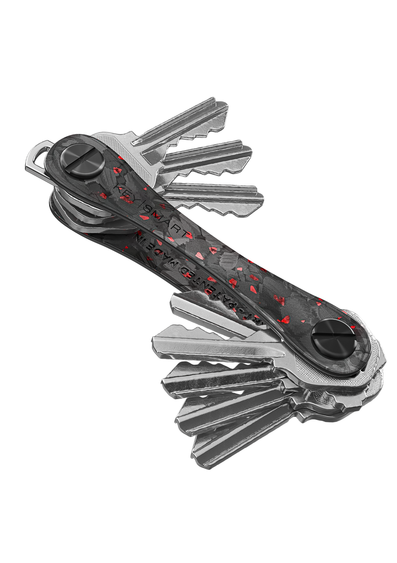 KeySmart Original Compact Key Holder in Red Forged Carbon is the world's first compact key organiser. Keeps your keys organised, compact and comfortable to carry! Put an end to bulky keyrings, annoying pokes, and key jingles. Organise all keys in only one slim keychain that fits perfectly in your pocket. Comes with 2 sets of screws, each to hold up 8 keys and another to hold up 14 keys. Choose your favourite Highly resistant and built to last, it has black stainless steel hardware and ultra-strong 2mm thick carbon fiber plates. Attach your car fob with the included loop ring. Features - Includes 1 x KeySmart Original Compact Key Holder Red Forged Carbon- No Key Jingle- Hold Up to 8 Keys- Fits almost any flat key (Posts are 4mm Diameter) - Durable Design Built to Last- Black Stainless Steel Hardware and 2mm Thick Carbon Fibre- Attach your Car Keys with Included Loop Ring