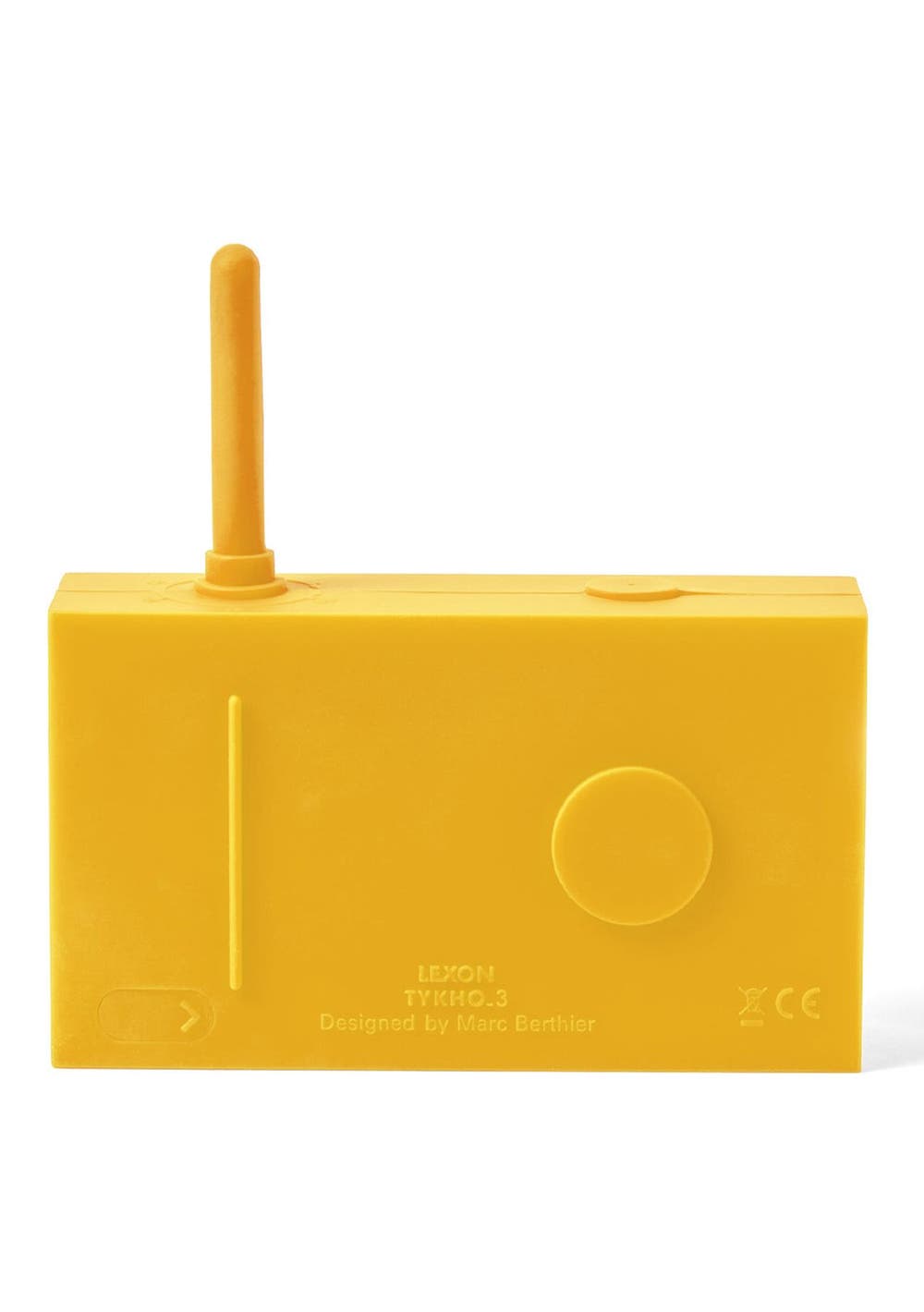 Lexon Thykho 3 Fm Radio & Bluetooth Speaker - Yellow - Our award-winning radio is an iconic design that‚s adapted with the times while staying true to what‚s important. Thykho‚s retro shape is reminiscent of the staple AM/FM radios that stood in our parents kitchens, but with a contemporary twist. We‚ve given the classic bestseller a modern Bluetooth upgrade complete with a 3W speaker. Enjoy the radio by pressing the FM button, and using the antenna to dial into your favourite station. Thanks to its splash-proof rubber finish Thykho 3 is the perfect companion for poolside lounging, listening to music while doing the dishes, or to have in the bathroom with you while getting ready. Enjoy up to 20 hours of continued playtime. Thykho 3 is also easily rechargeable via the provided Micro-USB cable.- FM radio ‚ 3W Bluetooth speaker- Splash-proof- Frequency range: FM 88-108MHz- Bluetooth range: 10m- Battery life: 20 h- Charging time: 4 h- Rechargeable on Micro-USB port (cable included)