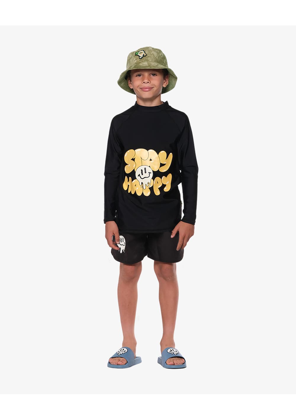 The black Stay Happy Rash shirt will keep your mini stylish and sun-safe, the stay happy graphic is printed on soft nylon + spandex quick drying material to keep your mini cool and comfy. Rated UPF50+, this rash shirt features long sleeves and a high neck for extra protection.