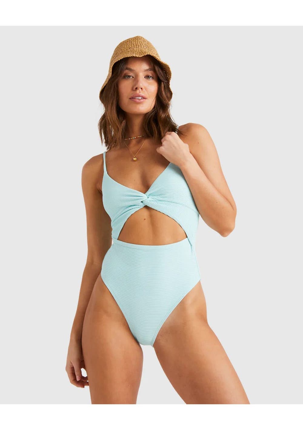 The Tanlines Mika One Piece from Billabong in Aqua features a stylish twist front and a chic cut-out design. Crafted from 100% recycled Tanlines Rib fabric, it combines comfort and sustainability. The high-leg cut and hike bum coverage create a flattering silhouette. With removable padding and adjustable ring & slider straps, you can easily customize your fit. Complete with a subtle metal plate branding, this one-piece is a must-have for your summer collection!