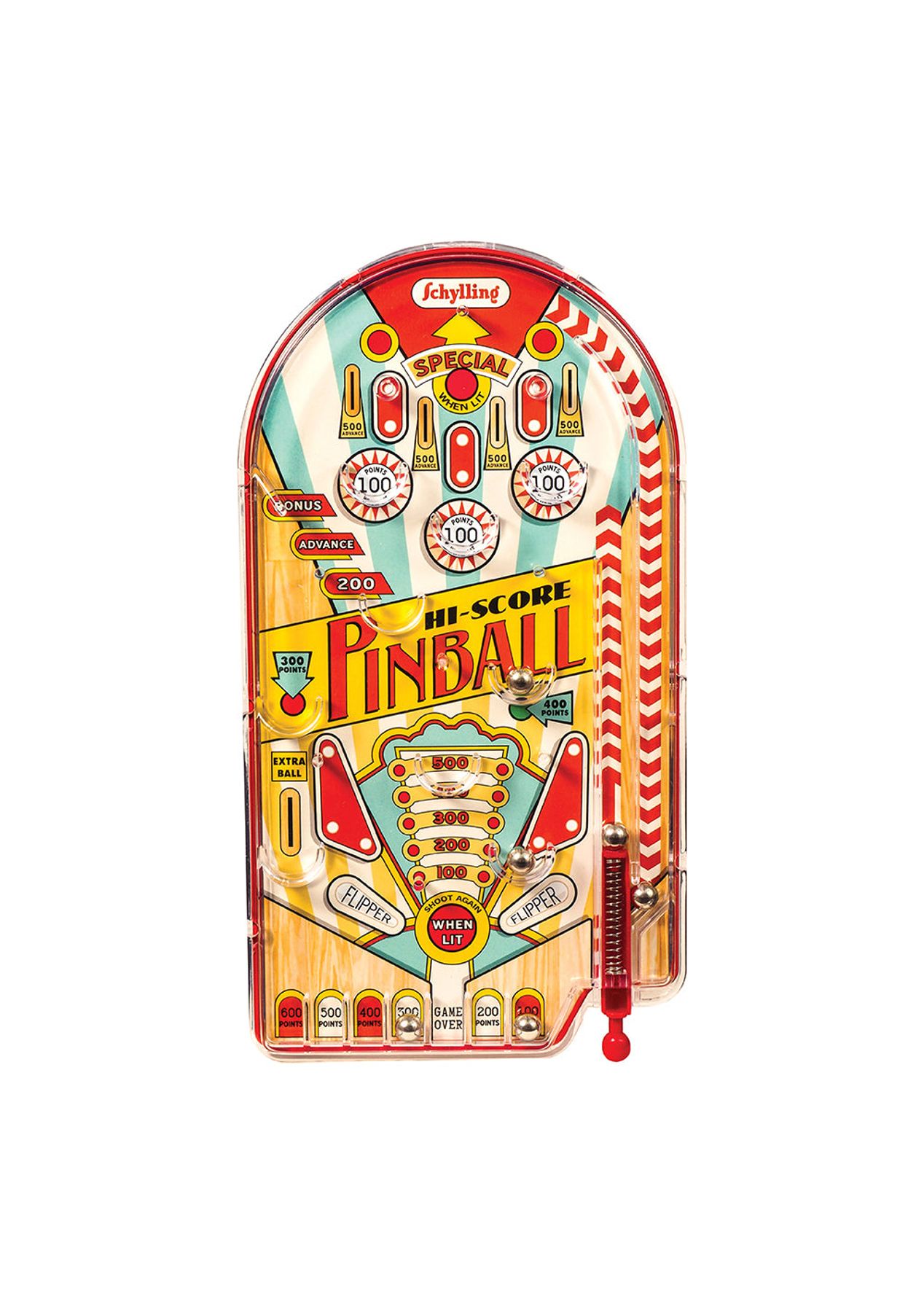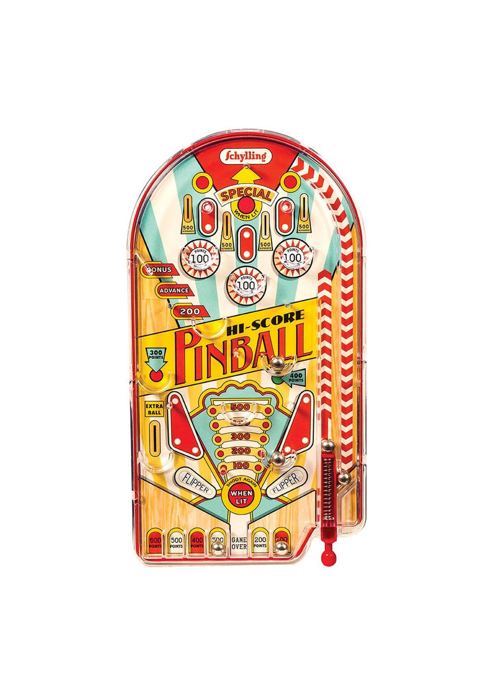 Challenge your skills and your friends with our fun pinball games! Kids will love playing the High-Score Pin Ball Game from Schylling Toys. Designed for ages 3 years and older, this hand held pin ball game features retro graphics. Measures 28.5cm x 13.3cm x 1.9cm in pkg.