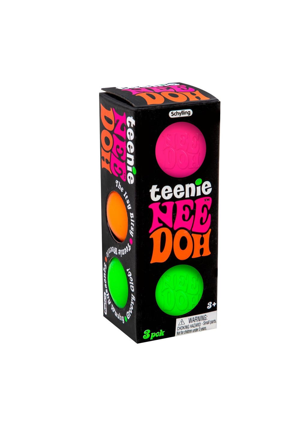 Nee Doh is a super soft and pliable rubber ball that can be squished and stretched to your heart's content. This pack contains three little Teenie balls of Nee Doh in a variety of fun colours! For kids and adults alike, this is one fidget toy you won't want to put down. * Recommended for ages 3+ years * Each pack contains 3 Teenie balls of Nee Doh * Size: 1.67"W (4.3cm) each * This item is assorted - each pack contains 3 different colours, which cannot be selected.