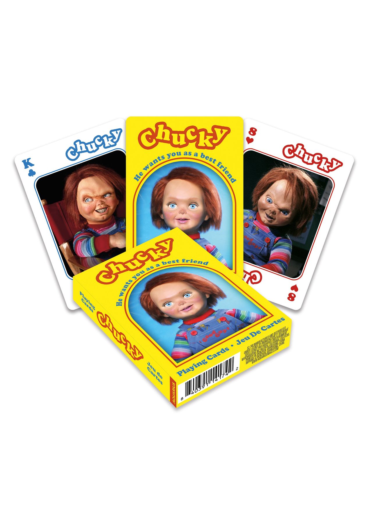 Escape death and let terror in! Bring a new playmate into the house with this officially licensed deck of playing cards featuring Chucky, the most dangerous of toys. Just remember, he wants you for a new best friend!