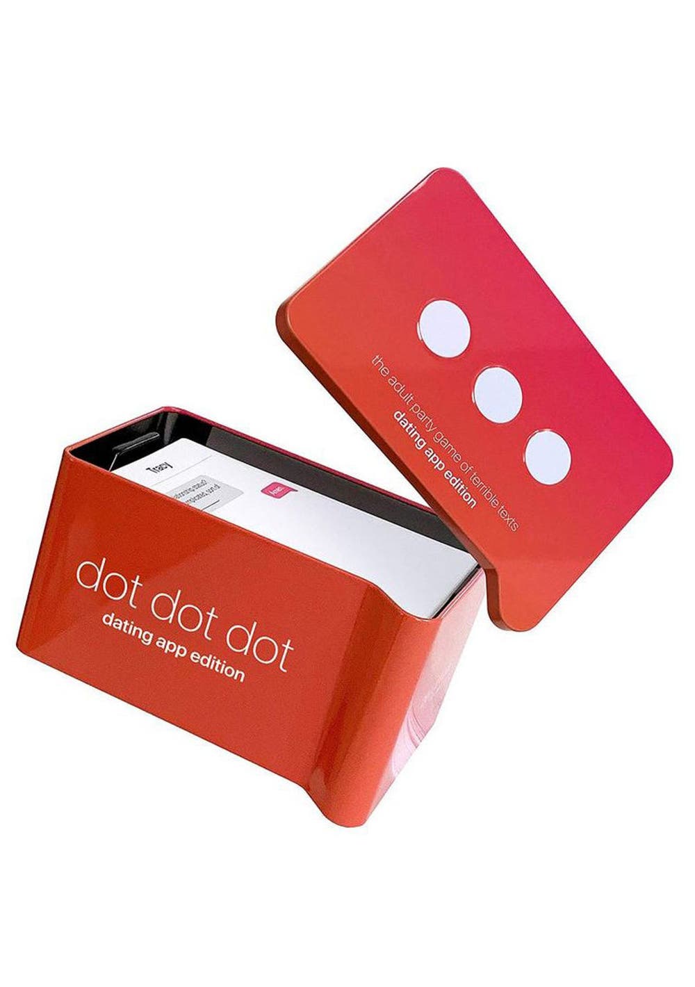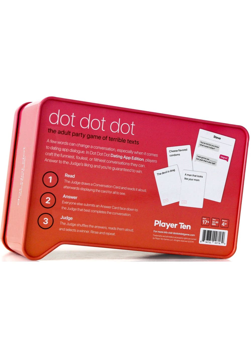 A party game where one work can make or break the conversation. A few words can change a conversation, especially when it comes to dating app dialogue. In Dot Dot Dot Dating App Edition, players craft the funniest, foulest, or filthiest conversations they can. Answer to the judges liking and you're guaranteed to win. * Ages 17+ * 30 to 60 Min Playtime * Players 4+