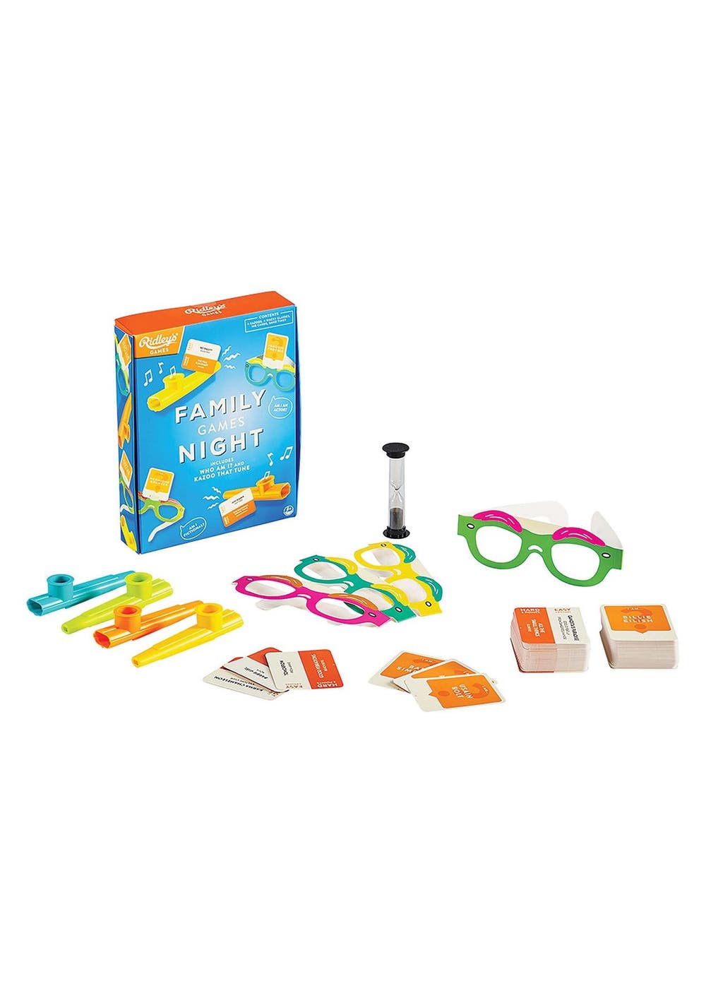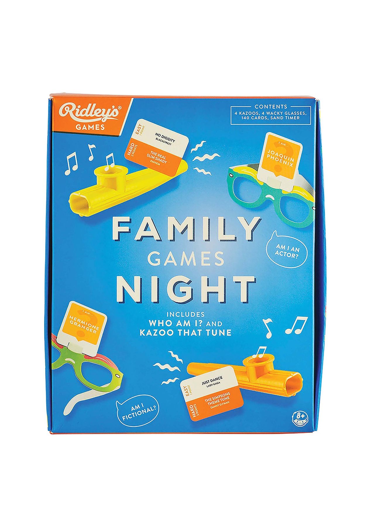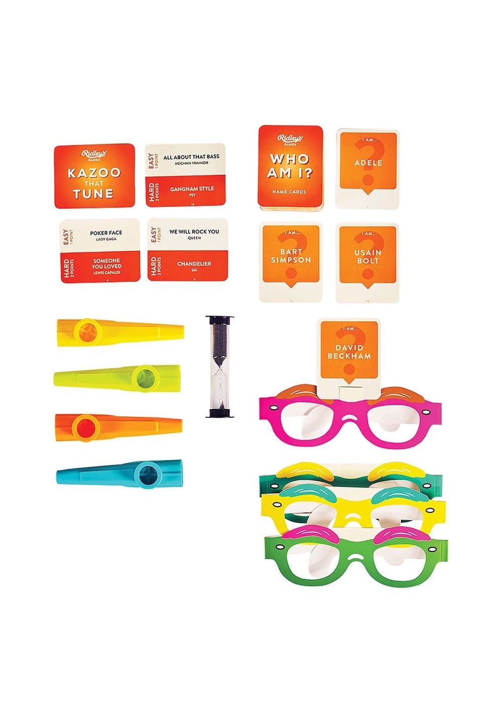 Put your friends and family to the test with this Family Games Night set from Ridley's Games! You'll have hours of fun with this entertaining collection of party favourites. Set includes two popular games: Kazoo That Tune and Who Am I Kazoo That Tune is a hilarious musical guessing game Who Am I is a game of silly guesses and sillier glasses Contains 4 kazoos, 70 tune cards, 4 wacky glasses, 70 name cards, sand timer and instructions Suitable for ages 8+