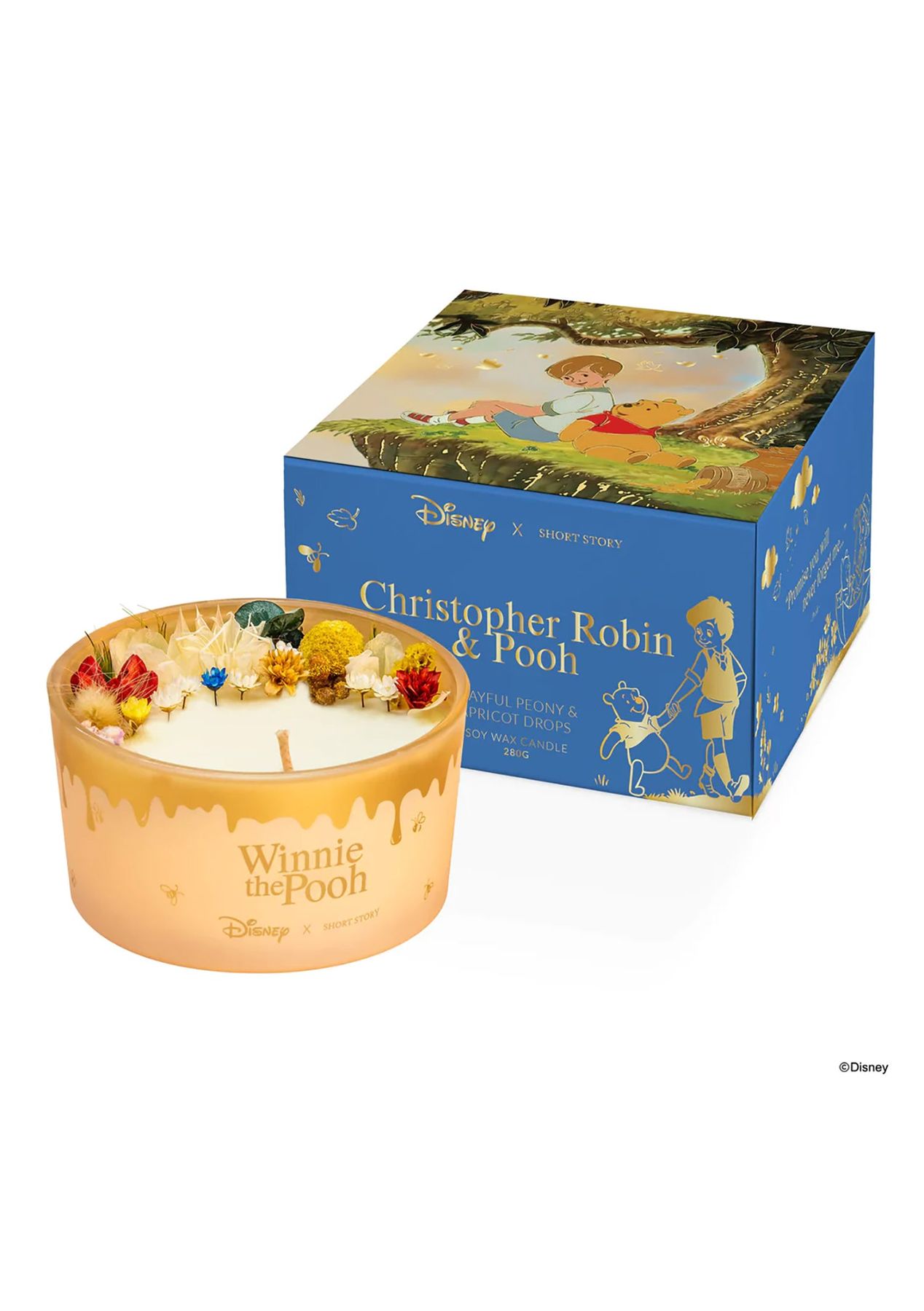 PLAYFUL PEONY & APRICOT DROPS Recreate the sunny afternoons from the Hundred Acre Woods with a delightful Disney x Short Story Christopher Robin & Pooh candle. Find yourself fondly recalling a certain silly old bear with delicious aromas of apricot, peony and musk that are sure to leave you soothed and smiling. All of our Disney x Short Story soy candles are made with real flower petals and come in a bespoke designed box accompanied by iconic imagery from your favourite Disney moments. Ready to be gifted to that special someone, or kept all for yourself, these Disney candles are a beautiful combination of the finest scents inspired by your favourite Disney characters. Discover magic, awaken nostalgia and be inspired by your favourite Disney stories. CHRISTOPHER ROBIN & POOH "You're braver than you believe, stronger than you seem, and smarter than you think." Christopher Robin & Pooh are an almost inseparable pair. Whether they're on an expedition or simply exploring the Hundred Acre Woods, they bring fun and cheer everywhere they go. Even on the rainiest of days, whenever they're together it's always a heartwarming day for everyone to remember. NOTES: Top: Apricot, freesia Middle: Peony, magnolia, lily of the valley Base: Musk FEATURES: - 280g - Real flower petals - 40 hour burn time - 100% cotton wick - Triple scented soy candle - Safety tested - Beautiful gift ready box with iconic imagery and gorgeous gold foil details - Inspired by the personality of a Disney character, carries their personality and iconic quote - Designed in Australia