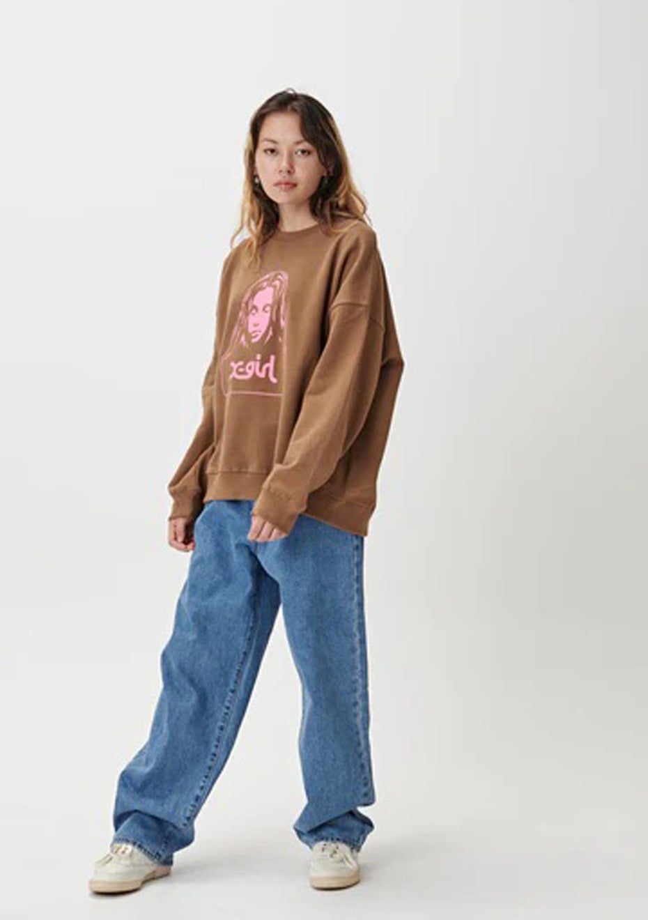 The Xgirl Face Crew in Brown is a classic sweatshirt silhouette, our fleece Crew comes in a relaxed fit with dropped shoulders. It features a ribbed crewneck and sleeve bands in soft cotton rib, with our iconic x-girl face logo in a puff print on the front. Made from 50% Cotton/ 50% Recycled Cotton Fleece. Model is 168cm tall with an 80cm bust, 64cm waist, 80cm hips and is wearing a size 10