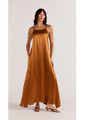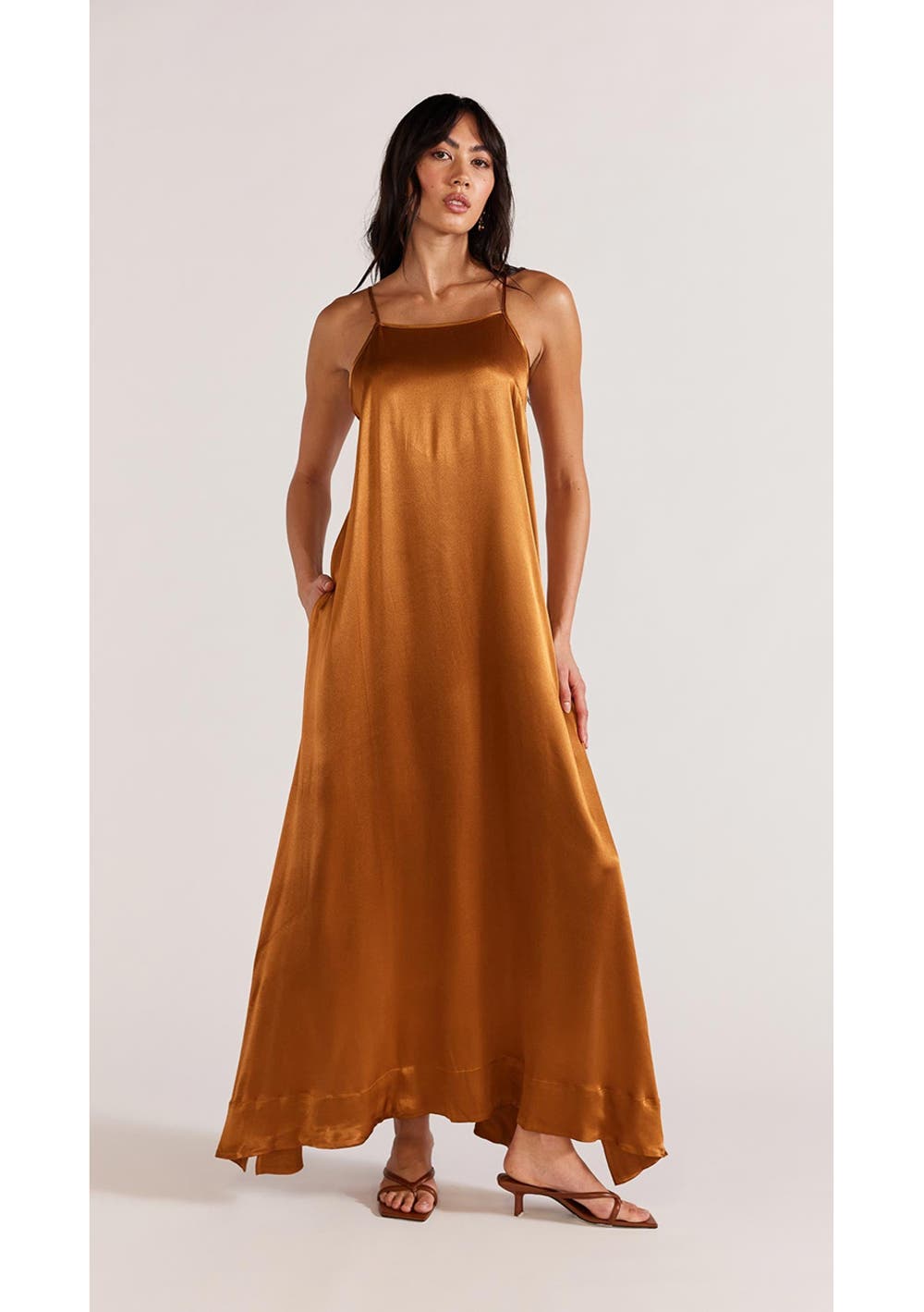 Full length satin maxi dress in copper hue -Apron neckline with thin adjustable straps -Pockets at hip - Side seam splits - Designed in Sydney, Australia