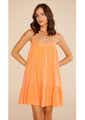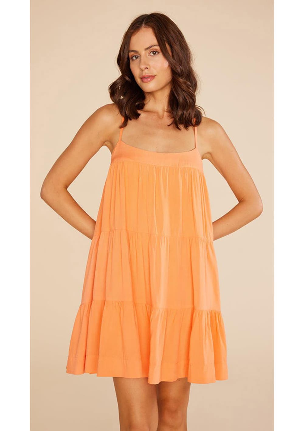 In a bold mandarin hue, the Eloise Tiered Mini Dress features a scoop neckline and adjustable straps.