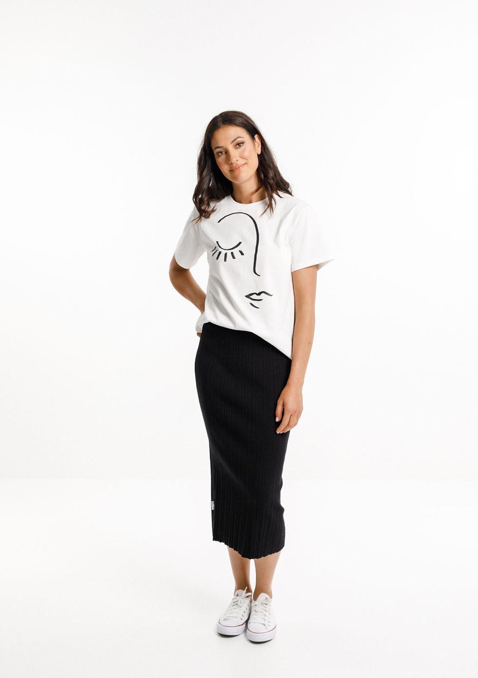 The perfect trans seasonal skirt every wardrobe needs! This Knitted Pencil Skirt is a midi length ribbed knitted skirt, with an elasticated waist and our signature Home-lee pip on the skirt seam. Designed to be that go-to skirt you can dress up or down. Style back with our studio shirt and heels for a more corporate look, or with our Chris Tee, Denim Jacket and flats for a casual coffee with the girls.